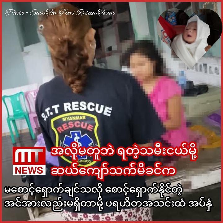 Save The Trees Rescue Team မှ ကိုကျော်သူရက “ပဲခူးတိုင်းထဲက ဆေးရုံတစ်ခုမှာပဲ မွေးဖွားဖို့ရော၊ မွေးစရိတ်ကအစ ကူညီပေးလိုက်ပါတယ်။ အခုလည်း ကလေးကို ကျွန်တော့်လက်ထဲ အပ်ချင်တယ်ပေါ့။ ကျွန်တော် အသင်းမှာ ကိုယ်တိုင်ပြုစု ပျိုးထောင်ပေးနေတာလည်းရှိသလို နီးစပ်ရာ ကလေးစောင့်ရှောက်ရေးဂေဟာ ပို့ပေးတာ၊ သင့်တော်ကောင်းမွန်တဲ့ မိဘရှာပေးပြီး သေသေချာချာ သက်ဆိုင်ရာကနေတစ်ဆင့် မွေးစားစေတာမျိုးနဲ့ ကူညီခဲ့ဖူးတာရှိပါတယ်။ အခု သမီးလေးလည်း အဲ့ဒီလိုပဲ ကူညီပေးရမှာပေါ့။ မိခင်ကလည်း ကလေးသာသာအရွယ်ပါပဲ” လို့ MT News က ဆက်သွယ်မေးမြန်းတာကို ပြန်လည်ဖြေကြားပါတယ်။