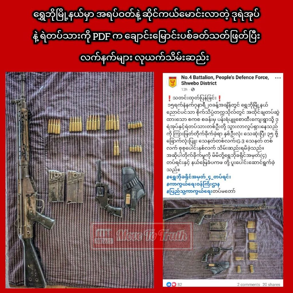စစ်ကိုင်းတိုင်း၊ ရွှေဘိုမြို့နယ်မှာ အရပ်ဝတ်နဲ့ ဆိုင်ကယ်စီးလာတဲ့ ဒုရဲအုပ်နဲ့ ရဲတပ်သားတို့ကို PDF တွေက ချောင်းမြောင်းပစ်ခတ်သတ်ဖြတ်ပြီး လက်နက်ခဲယမ်းတွေနဲ့အတူ အသေဖမ်းဆီးခဲ့တယ်လို့ ကျူးလွန်တဲ့ NUG လက်အောက်ခံ ရွှေဘိုခရိုင် အမှတ် (၄) တပ်ရင်းက ဝန်ခံထားပါတယ်။
