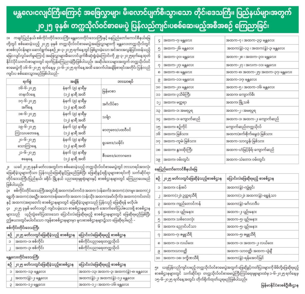 မန္တလေးငလျင်ကြီးကြောင့် တက္ကသိုလ်ဝင်စာမေးပွဲဖြေလွှာတချို့ ထိခိုက်ပျက်စီးဆုံးရှုံးခဲ့ရမှုအပေါ် ပြန်လည်မဖြေဆိုဘဲ ဖြေလျော့မှုဖြင့် စာမေးပွဲအအောင်ပေးရန် ပြောဆိုနေမှုများရှိနေသော်လည်း သိက္ခာရှိသည့် အောင်မြင်မှုမျိုးနှင့် နိုင်ငံတကာ စံချိန်စံနှုန်းများအရ စာမေးပွဲပြန်လည်ဖြေဆိုရန် ဆုံးဖြတ်ခဲ့ရခြင်းဖြစ်ကြောင်း နိုင်ငံတော်စီမံအုပ်ချုပ်ရေးကောင်စီ (SAC) ဥက္ကဋ္ဌ ဗိုလ်ချုပ်မှူးကြီးမင်းအောင်လှိုင်က ယနေ့ ပြုလုပ်သည့် နိုင်ငံတော်စီမံအုပ်ချုပ်ရေးကောင်စီအစိုးရအဖွဲ့ လုပ်ငန်းညှိနှိုင်းအစည်းအဝေးတွင် ပြောကြားသည်။