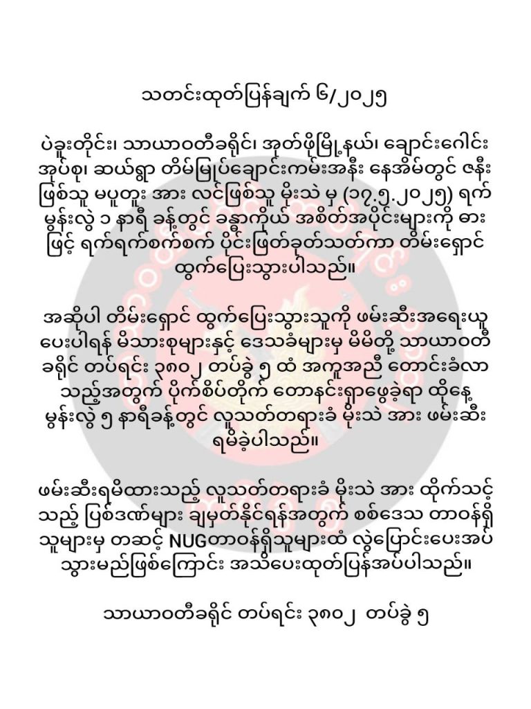 အပြစ်မဲ့ပြည်သူများစွာကို စစ်ဆေးမေးမြန်းမှုမရှိ အကြောင်းမဲ့သတ်ဖြတ်နေတဲ့ သာယာဝတီခရိုင် တပ်ရင်း ၃၈၀၂ တပ်ခွဲ ၅ ဟာ လူသတ်တရားခံမိုးသဲကိုတော့ ရက်စက်စွာပြစ်မှုကျူးလွန်ထားတာ လက်ပူးလက်ကျပ် မိပေမဲ့ ထိုက်သင့်တဲ့ ပြစ်ဒဏ် ချမှတ်ဖို့အတွက် စစ်ဒေသ တာဝန်ရှိသူတွေက တစ်ဆင့် NUGတာဝန်ရှိသူတွေထံ လွှဲပြောင်းပေးအပ်သွားမယ်လို့ပဲ ဖော်ပြထားပါတယ်။
