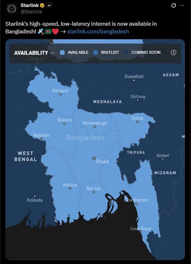 Starlink က အင်္ဂါနေ့တွင် ၎င်း၏ X အကောင့်မှတစ်ဆင့် “Starlink ၏ မြန်နှုန်းမြင့်၊ နှောင့်နှေးကျဆင်းမှု နည်းပါးသော အင်တာနက်ကို ယခုအခါ ဘင်္ဂလားဒေ့ရှ်တွင် ရရှိနိုင်ပါပြီ” ဟု ကြေညာခဲ့သည်။