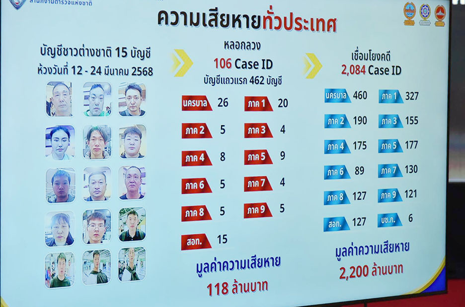 ထိုင်းတော်ဝင်ရဲတပ်ဖွဲ့၏ အထွေထွေစစ်ဆေးရေးချုပ်နှင့် နည်းပညာရာဇဝတ်မှုနှိမ်နင်းရေးဌာန၏ ညွှန်ကြားရေးမှူး ရဲချုပ် သက်ချိုင်း ပီတာနီလာဘတ်က ယနေ့ မေလ ၂၁ ရက်နေ့တွင် တော်ဝင်ထိုင်းရဲတပ်ဖွဲ့ဌာနချုပ်၌ အဆိုပါ အွန်လိုင်းလိမ်လည်မှု အဓိကစစ်ဆင်ရေး၏ ရလဒ်များကို ကြေညာရန် သတင်းစာရှင်းလင်းပွဲတစ်ခု ပြုလုပ်ခဲ့သည်။