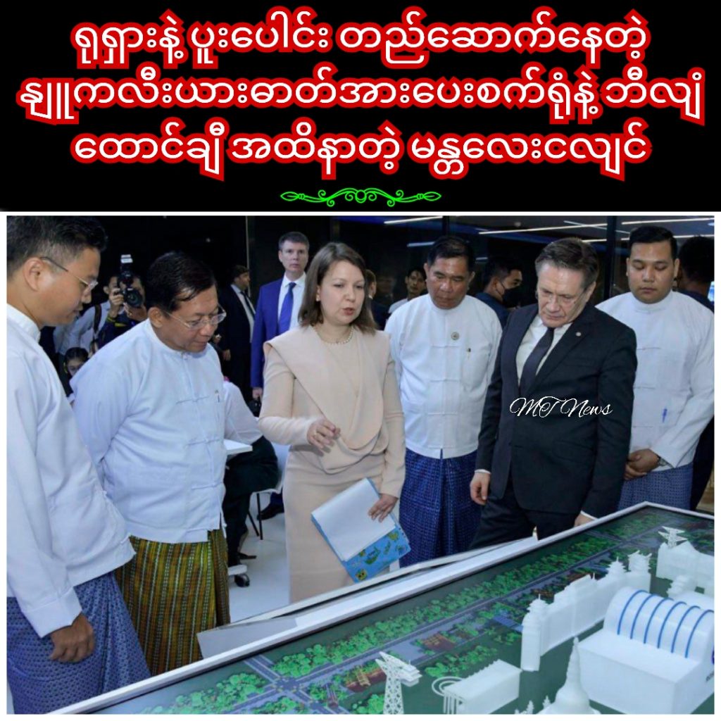 “ရုရှားနဲ့ မြန်မာ ပူးပေါင်းဆောင်ရွက်မှုနယ်ပယ်ကလည်း ကျယ်ပြန့်တယ် ခင်ဗျာ။ ခင်ဗျား ခုနက ပြောသလို ကာကွယ်ရေးကဏ္ဍတင်မကဘူး။ ကျွန်တော်တို့ သိပ္ပံနဲ့ နည်းပညာ နောက်တစ်ခါ စီးပွားရေး၊ နောက်တစ်ခု ဥပဒေဘက်ဆိုင်ရာ၊ နောက် ပညာရေး၊ ကျန်းမာရေး ဒီနယ်ပယ်တွေ အများကြီးရှိပါတယ်။ ဆွေးနွေးတဲ့ကိစ္စတွေလည်း ရှိပါတယ်။ ကျွန်တော် ပြီးခဲ့တဲ့ မတ်လခရီးစဉ်မှာလာတဲ့ အချိန်တုန်းက နျူကလီးယားနဲ့ ပတ်သက်တဲ့ ဓာတ်အားပေးစက်ရုံတည်ဆောက်ရေးကိစ္စ၊ ထားဝယ်ရေနက်ဆိပ်ကမ်း တည်ဆောက်ရေးကိစ္စတွေ၊ နောက်ကမ်းလွန်ရေနံနဲ့ ဓာတ်ငွေ့ထုတ်လုပ်ရေးအတွက် ရင်းနှီးမြှုပ်နှံမယ့်ကိစ္စတွေ ဒါတွေ ဆွေးနွေးနိုင်ခဲ့တာတွေ ရှိပါတယ်။ သဘောတူတာလည်းရှိပါတယ်။ လုပ်နေတာလည်းရှိပါတယ်။ ဆက်လက်ပြီး လုပ်ရမယ့်နယ်ပယ်တွေလည်း များစွာရှိပါသေးတယ်လို့ ကျွန်တော်ပြောချင်ပါတယ်။”လို့ နိုင်ငံတော်စီမံအုပ်ချုပ်ရေးကောင်စီဥက္ကဋ္ဌ ဗိုလ်ချုပ်မှူးကြီး မင်းအောင်လှိုင်က ရုရှားမီဒီယာ RT TV Channel နဲ့ တွေ့ဆုံ မေးမြန်းရာမှာ ဖြေကြားခဲ့ပါတယ်။