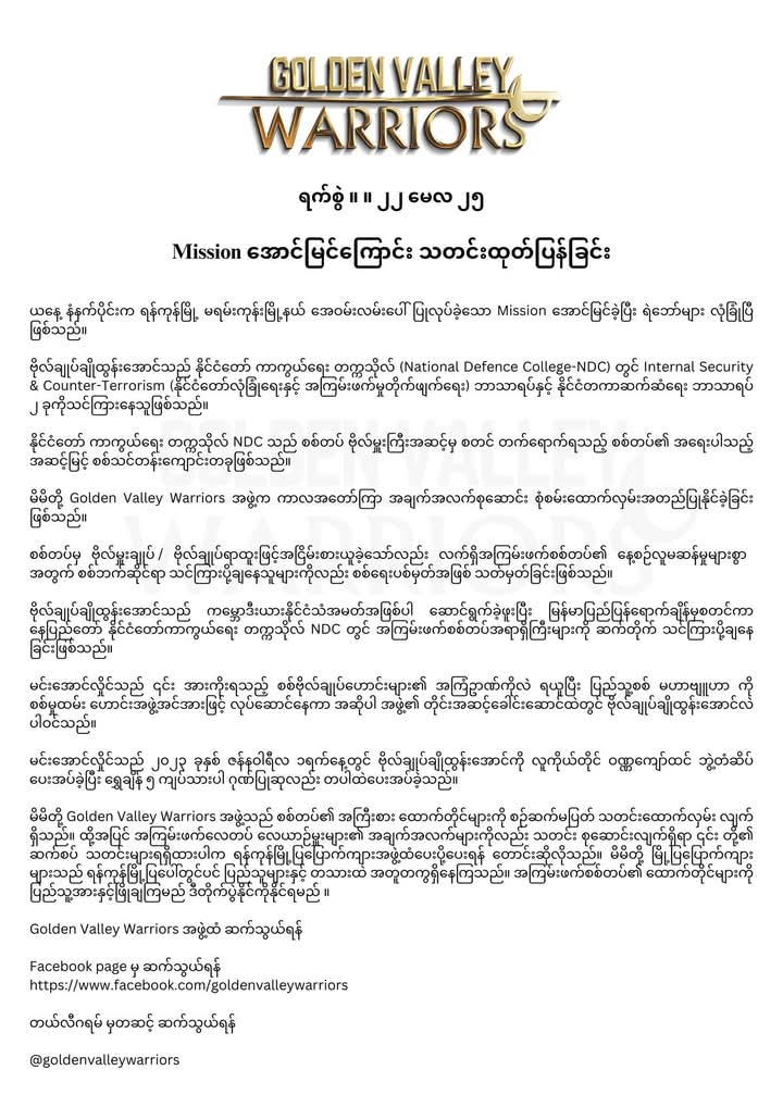 ယနေ့ နံနက်ပိုင်းက ရန်ကုန်မြို့ မရမ်းကုန်းမြို့နယ် အေဝမ်းလမ်းပေါ်တွင် အငြိမ်းစားဗိုလ်ချုပ်တစ်ဦးကို လုပ်ကြံခဲ့သော Mission အောင်မြင်ခဲ့ပြီး ရဲဘော်များ လုံခြုံပြီ ဖြစ်သည်ဟု Golden Valley Warriors အဖွဲ့က ယခု ဝန်ခံချက် ထုတ်ပြန်လာသည်။