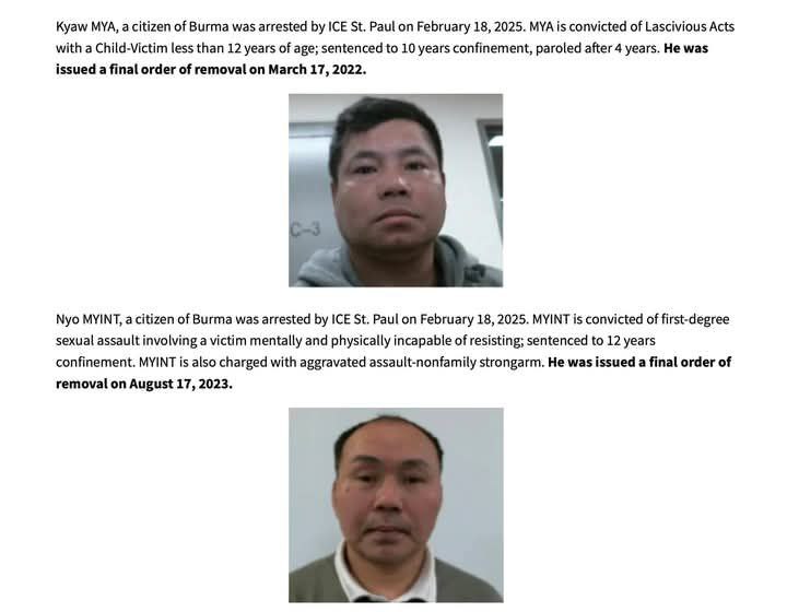 ထို့အတူ စိတ်ပိုင်းဆိုင်ရာနှင့် ရုပ်ပိုင်းဆိုင်ရာ ခုခံနိုင်စွမ်းမရှိသော သားကောင်တစ်ဦးအား အပြင်းထန်ဆုံးလိင်ပိုင်းဆိုင်ရာ တိုက်ခိုက်မှုဖြင့် ထောင်ဒဏ် ၁၂ နှစ် ချမှတ်ခံရသည့် ညိုမြင့်ဆိုသူ မြန်မာဒုက္ခသည်တစ်ဦးကိုလည်း တောင်ဆူဒန်သို့ ပို့လိုက်ကာ ညိုမြင့်၏ ပြစ်မှုတွင် မိသားစုဝင်မဟုတ်သူအား ပြင်းထန်စွာ တိုက်ခိုက်မှု စွဲချက်လည်း ပါဝင်ခဲ့ပြီး ၂၀၂၅ ခုနှစ် ဖေဖော်ဝါရီလ ၁၉ ရက်နေ့တွင် ICE(Immigration and Customs Enforcement) က ဖမ်းဆီးခဲ့သည်ဟု ဖော်ပြခဲ့သည်။