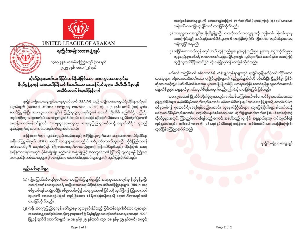 အဆိုပါ ထုတ်ပြန်ချက်တွင် လူငယ်လူရွယ်အနည်းစုအနေဖြင့် AA က ပြဋ္ဌာန်းလိုက်သော အမျိုးသားကာကွယ်ရေးဆိုင်ရာ အရေးပေါ်ပြဋ္ဌာန်းချက် (NDEP) အပေါ် သေချာစွာနားမလည်ဘဲ အဓိပ္ပာယ်ကောက်လွဲမှားပြီး တိုင်းပြည်တာဝန် ထမ်းဆောင်မှုကို ရှောင်လွှဲရန် ကြိုးစားအားထုတ်လာသည်ကို ကြားသိရကြောင်း၊ ယခုကာလ အ တွင်း ပုံစံအမျိုးမျိုး၊ နည်းလမ်းအမျိုးမျိုးဖြင့် ရခိုင်ပြည်နယ်ပြင်ပသို့ ထွက်ခွာရန် ကြိုးစား အားထုတ်နေကြသူများအတွက် စည်းကမ်းချက်များ ထုတ်ပြန်ခြင်း ဖြစ်ကြောင်း ဖော်ပြထားသည်။