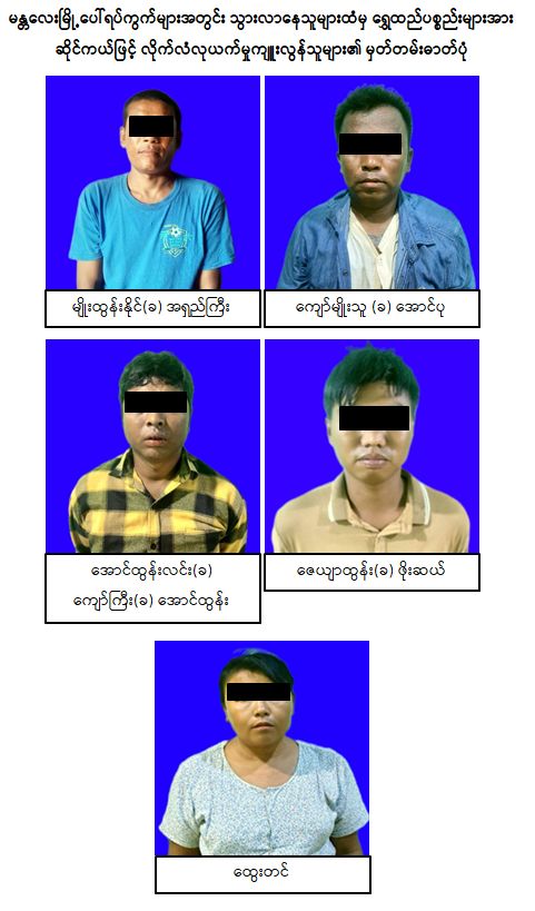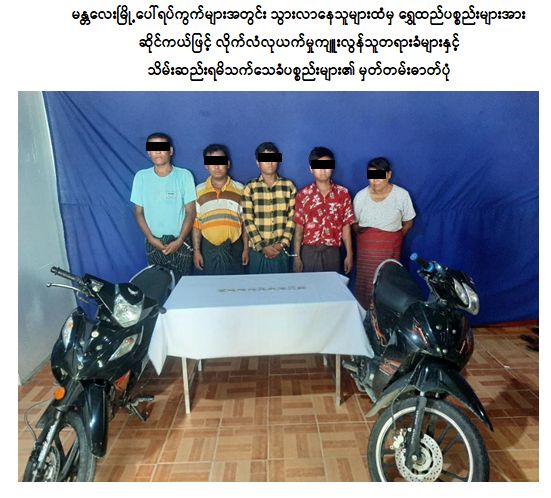 မန္တလေးမြို့ပေါ်ရပ်ကွက်များအတွင်း သွားလာနေသူများထံမှ ရွှေထည်ပစ္စည်းများအား ဆိုင်ကယ်ဖြင့် လိုက်လံလုယက်မှုကျူးလွန်သူများနှင့် လုယက်ခံရွှေထည်များ ရောင်းချပေးသူ ကြံရာပါတစ်ဦးတို့အား ဖော်ထုတ်ဖမ်းဆီးနိုင်ခဲ့ကြောင်း သတင်းမှန်ထုတ်ပြန်ရေးအဖွဲ့က ယခုည ထုတ်ပြန်သည်။