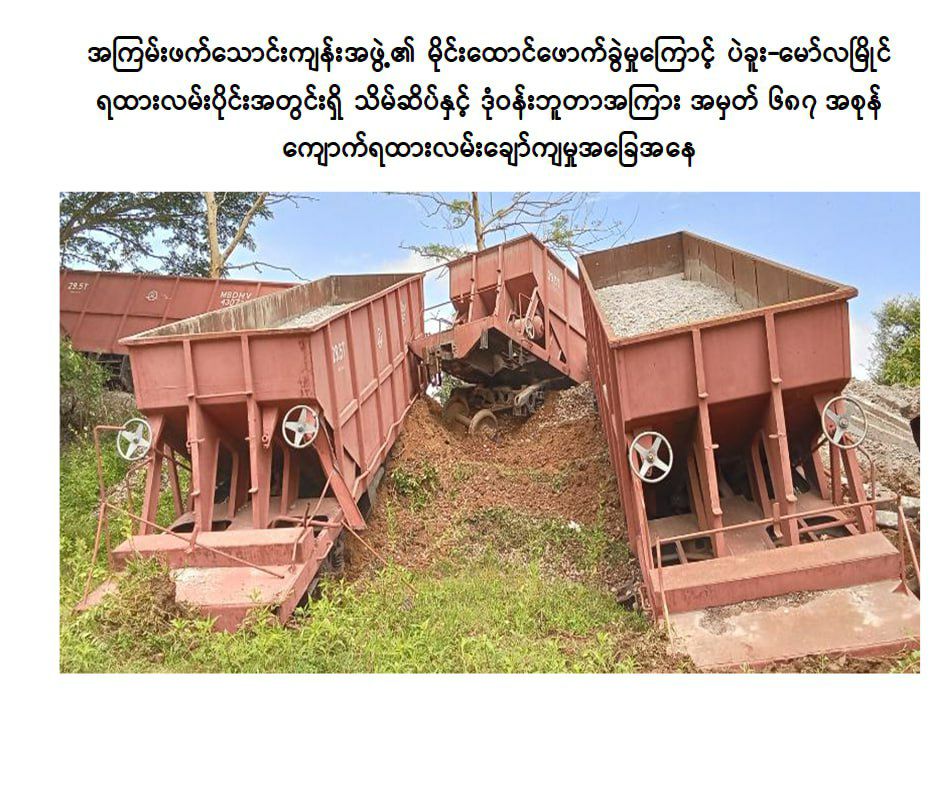 အကြမ်းဖက်သောင်းကျန်းသူအဖွဲ့များအနေဖြင့် ၂၀၂၁ ခုနှစ်၊ ဖေဖော်ဝါရီလမှစ၍ ယခုအချိန်အထိ မြန်မာ့မီးရထားလမ်းကွန်ရက်တစ်ခုလုံးတွင် ရထားလမ်းနှင့် ရထားဘူတာနယ်မြေအတွင်း မိုင်းထောင်ဖောက်ခွဲဖျက်ဆီးခြင်း(၈၂)ကြိမ်၊ ရထားတံတား/သံလမ်းများအား မိုင်းထောင်ဖောက်ခွဲဖျက်ဆီးခြင်း (၁၇၆) ကြိမ်၊ ဘူတာအဆောက်အဦနှင့် ဝန်ထမ်းနေအိမ်များအား မီးရှို့ဖျက်ဆီးခြင်း(၁၆)ကြိမ် ကျူးလွန်ခဲ့ကြပြီး နိုင်ငံတော်ပိုင်ရထားစက်ခေါင်းနှင့် တွဲများ၊ ရထားလမ်းနှင့် တံတားများ၊ ခရီးသည်များနှင့် ကုန်စည်များ ထိခိုက်ပျက်စီးဆုံးရှုံးစေရေး၊ ရထားစီး ခရီးသွားပြည်သူများအနေဖြင့် ရထားဖြင့်ခရီးသွားလာရာတွင် ကိုယ်စိတ်နှလုံးချမ်းမြေ့ပြီး အသက်အန္တရာယ်ကင်းရှင်းစွာဖြင့် လုံခြုံစိတ်ချစွာ သွားလာနိုင်မှုမရှိစေရေးအတွက် ရည်ရွယ်ပြီး ယခုကဲ့သို့ အကြိမ်ကြိမ်ကျူးလွန်ဖျက်ဆီးနေကြခြင်းဖြစ်သော်လည်း နိုင်ငံတော်အစိုးရအနေဖြင့် အများပြည်သူခရီးသွားလာမှုနှင့် ကုန်စည်ပို့ဆောင်မှု အဆင်ပြေချောမွေ့မြန်ဆန်စေရေးအတွက် ရထားလမ်းနှင့်အခြေခံအဆောက်အဦများ ပိုမိုတိုးတက်ကောင်းမွန်လာစေရေးနှင့် ရထားပို့ဆောင်ရေးစနစ်အဆင့်မြှင့်တင်ရေးစီမံကိန်းလုပ်ငန်းများကို ရည်မှန်းချက်ထားရှိ၍ အစဉ်တစိုက် အလေးထားစီမံဆောင်ရွက်ပေးလျက်ရှိကြောင်း သတင်းရရှိသည်။