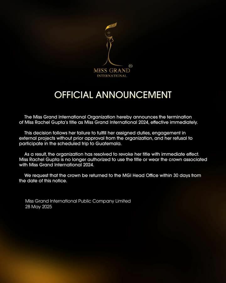 Miss Grand International (MGI) အဖွဲ့အစည်းက ၂၀၂၄ ခုနှစ်အတွက် Miss Grand India အလှမယ် Queen Rachel Gupta ရဲ့ Crown ကို ပြန်လည်သိမ်းဆည်းလိုက်ကြောင်း တရားဝင် ထုတ်ပြန်ကြေညာလာပါတယ်။