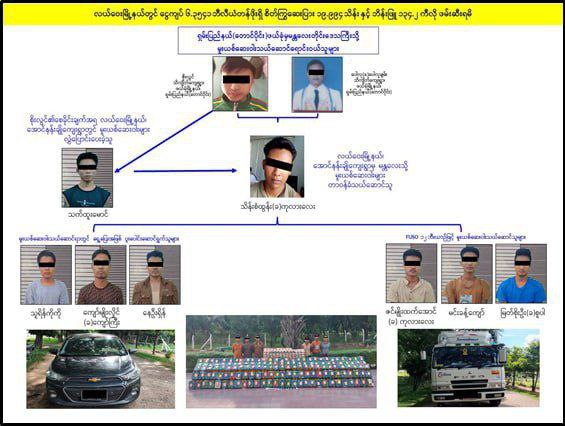 ဖမ်းမိတရားခံများမှတစ်ဆင့် ကွင်းဆက် ဖော်ထုတ်ချက်အရ ဖမ်းဆီးရမိ မူးယစ်ဆေးဝါးများအား လယ်ဝေးမြို့နယ်၊ အောင်နန်းချိုကျေးရွာအနီး၌ လွှဲပြောင်းပေးခဲ့သူ သက်ထူးမောင်အား မေလ ၂၁ ရက်နေ့ နံနက် ၉ နာရီအချိန် ပျဉ်းမနားမြို့၊ ပန်းခင်းလမ်းရှိဟိုတယ်တွင် ဆက်လက်ဖမ်းဆီးရမိခဲ့ပြီး ၎င်း၏ဖော်ထုတ်ချက်အရ ဖမ်းဆီးရမိ မူးယစ်ဆေးဝါးများအား ရှမ်းပြည်နယ်မှ မန္တလေးတိုင်းဒေသကြီးသို့ သယ်ဆောင်ခိုင်းသူများမှာ ဖယ်ခုံမြို့နေ ပေါလု(ခ)ပေါလူချမ်းနှင့် စိုးလွင် တို့ဖြစ်ပြီး မူးယစ်ဆေးဝါးများ တာဝန်ခံသယ်ဆောင်သူမှာ ရမည်းသင်းမြို့နယ်နေ သိန်းစံထွန်း(ခ) ကုလားလေး ဖြစ်ကြောင်းသိရှိရသဖြင့် ၎င်းတို့အား ဥပဒေအရအရေးယူ ထားရှိကာ ကွင်းဆက်ပြစ်မှု ကျူးလွန်သူများအား ဆက်လက်ဖော်ထုတ်လျက် ရှိကြောင်းနှင့် ၎င်းတို့၏ မူးယစ်ဆေးဝါး သယ်ဆောင်ရောင်းဝယ်ရာမှရရှိသည့် ငွေကြေးအကျိုး အမြတ်များ၊ ပိုင်ဆိုင်မှုများကို ပြည်သူ့ဘဏ္ဍာအဖြစ် သိမ်းဆည်းနိုင်ရေးအတွက် ငွေကြေးခဝါချမှု တိုက်ဖျက်ရေးဥပဒေဖြင့် အရေးယူ နိုင်ရေး ဆောင်ရွက်လျက်ရှိကြောင်း မြန်မာနိုင်ငံရဲတပ်ဖွဲ့မှ သိရှိရသည်။