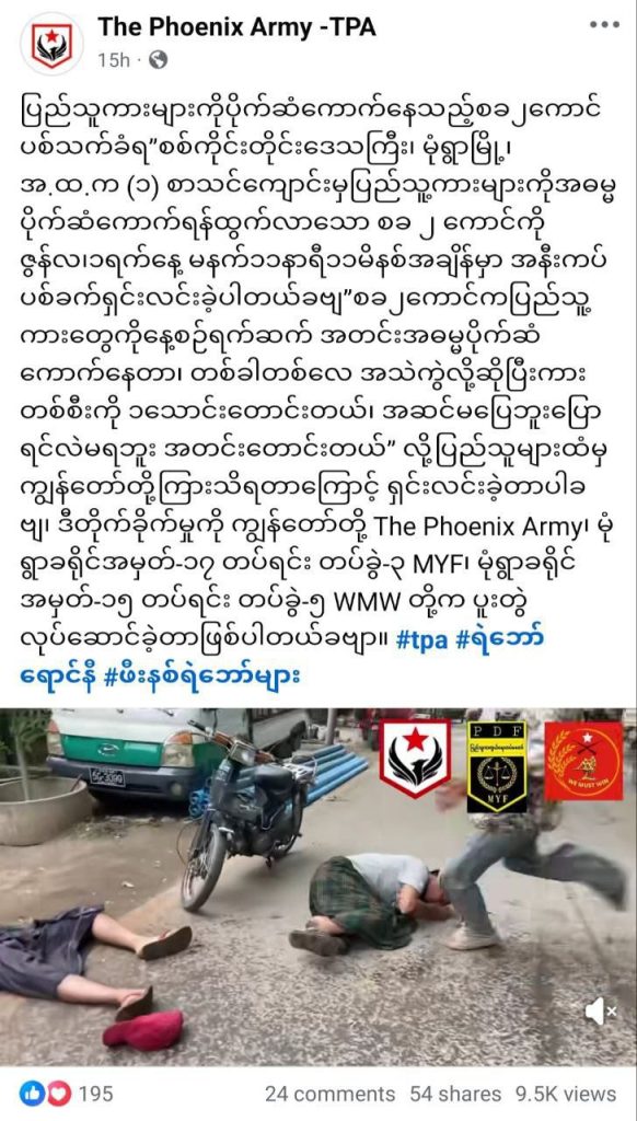 မုံရွာမှာ မနေ့ကဖြစ်ပွားခဲ့တဲ့ PDF သုံးဖွဲ့ပေါင်းပြီး ပြည်သူနှစ်ဦးကို ပစ်သတ်၊ ဆိုင်ကယ်လုယက်နေတဲ့ ရုပ်သံတစ်ခု ကျူးလွန်တဲ့ PDF တွေဆီကနေ ထွက်ပေါ်လာပါတယ်။