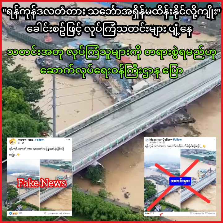 “ရန်ကုန်ဒလတံတား သင်္ဘောအရှိန်မထိန်းနိုင်လို့ကျိုး” ဟူသည် ခေါင်းစဥ်ဖြင့် လူမှုကွန်ရက်တွင် လုပ်ကြံသတင်းများ ပျံ့နေသည့်အပေါ် သတင်းအတု လုပ်ကြံသူများအား တရားစွဲရမည်ဟု ဆောက်လုပ်ရေးဝန်ကြီးဌာန အရာရှိတစ်ဦးက MT News ကို ယနေ့ ဇွန်လ ၃ ရက်တွင် ပြောသည်။