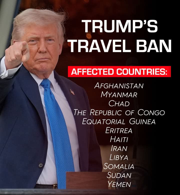 အမေရိကန်နိုင်ငံကို ခရီးသွားလာမှု ပိတ်ပင်ခံရတဲ့နိုင်ငံ ၁၂ နိုင်ငံမှာတော့ အာဖဂန်နစ္စတန်၊ ချတ်ဒ်၊ အီကွေတိုရီးယယ်လ် ဂီနီ၊ အီရီထရီးယား၊ ဟေတီ၊ အီရန်၊ လစ်ဗျား၊ မြန်မာ၊ ကွန်ဂိုသမ္မတနိုင်ငံ၊ ဆိုမာလီယား၊ ဆူဒန်နဲ့ ယီမင်နိုင်ငံတို့ ပါဝင်ပါတယ်။
