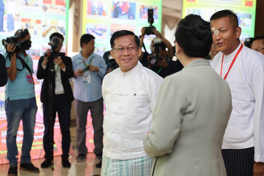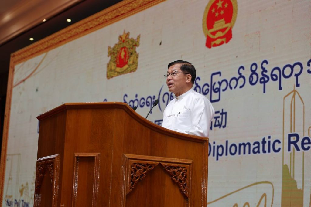 မြန်မာ – တရုတ် နှစ်နိုင်ငံသံတမန်ဆက်ဆံရေးထူထောင်မှု (၇၅) နှစ်မြောက် စိန်ရတုအထိမ်းအမှတ်အခမ်းအနားကို ယနေ့နံနက်ပိုင်းတွင် နေပြည်တော်ရှိ မင်္ဂလာသီရိဟိုတယ်၌ ကျင်းပပြုလုပ်ရာ နိုင်ငံတော်စီမံအုပ်ချုပ်ရေးကောင်စီ (SAC) ဥက္ကဋ္ဌ နိုင်ငံတော်ဝန်ကြီးချုပ် ဗိုလ်ချုပ်မှူးကြီး မင်းအောင်လှိုင် တက်ရောက်၍ အမှာစကားပြောကြားသည်။