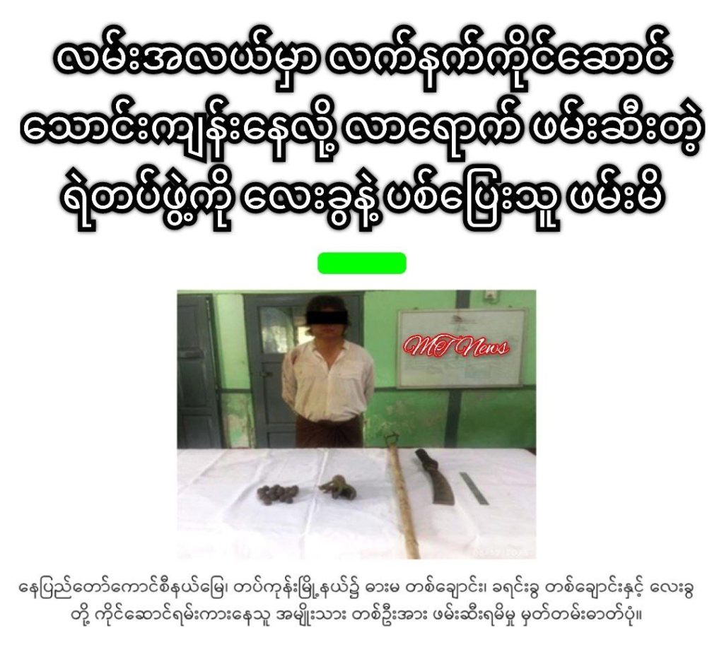 နေပြည်တော်ကောင်စီနယ်မြေ၊ တပ်ကုန်းမြို့နယ်မှာ ဓားမတစ်ချောင်း၊ ခရင်းခွတစ်ချောင်းနဲ့ လေးခွတို့ ကိုင်ဆောင်ရမ်းကားနေသူ အမျိုးသားတစ်ဦးကို ရဲတပ်ဖွဲ့က သွားရောက်ဖမ်းဆီးအရေးယူရာမှာ လေးခွနဲ့ပစ်ပြေးပေမဲ့ ဖမ်းမိခဲ့တဲ့ဖြစ်စဥ် ဖြစ်ပွားခဲ့ပါတယ်။