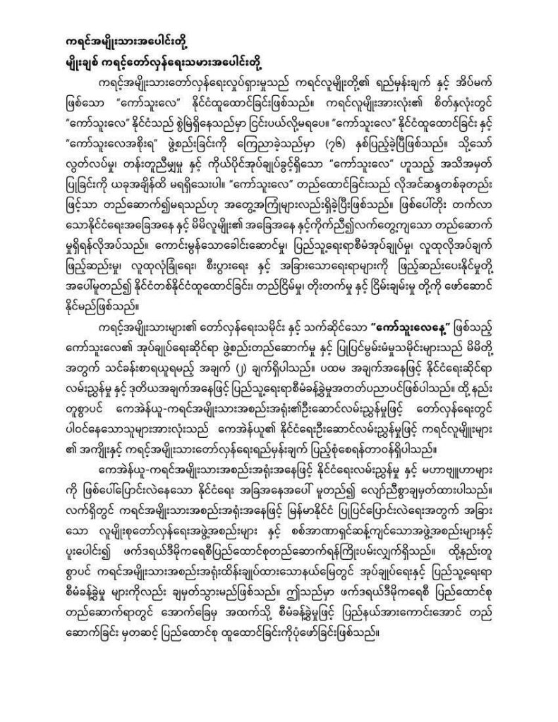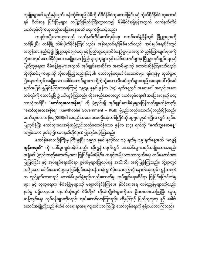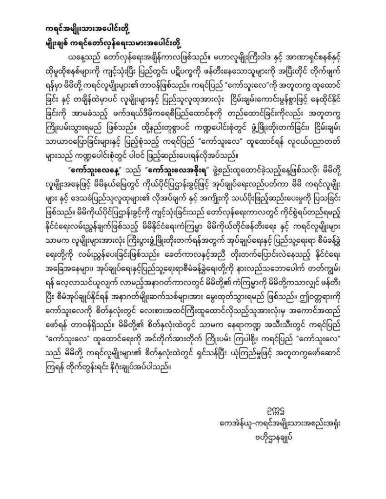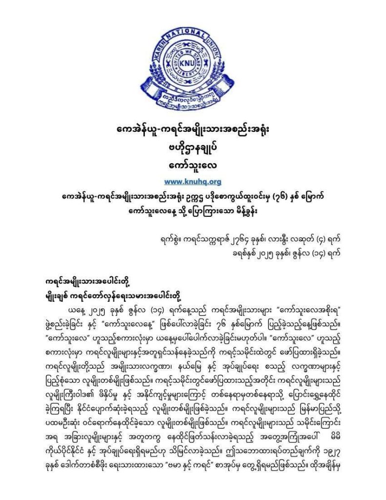 ကရင်တို့၏ အိပ်မက်ဖြစ်သည့် ကော်သူးလေနိုင်ငံနှင့် ကော်သူးလေအစိုးရ ထူထောင်ခဲ့သည်မှာ ၇၆ နှစ်ကြာပြီဖြစ်သော်လည်း အောင်မြင်မှုမရသေးဟု KNU (ကရင်အမျိုးသားအစည်းအရုံး) ဥက္ကဋ္ဌ ပဒိုစောကွယ်ထူးဝင်းက ယနေ့ကျရောက်သည့် (၇၆) နှစ်မြောက် ကော်သူးလေနေ့သို့ ပြောကြားသော မိန့်ခွန်းတွင် ညည်းတွားဝန်ခံလာသည်။