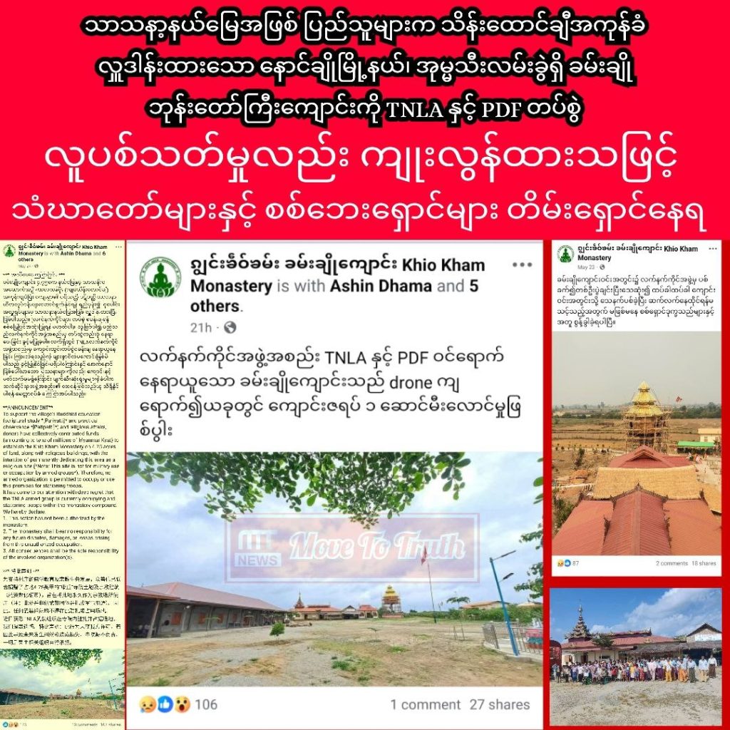 သာသနာ့နယ်မြေအဖြစ် ပြည်သူများက သိန်းထောင်ချီအကုန်ံ လှူဒါန်းထားသော နောင်ချိုမြို့နယ်၊ အုမ္မသီးရွာလမ်းခွဲရှိ ခမ်းချို ဘုန်းတော်ကြီးကျောင်းကို TNLA နှင့် PDF တို့က တပ်စွဲထားကာ လူပစ်သတ်မှုလည်း ကျုးလွန်ထားသဖြင့် သံဃာတော်များနှင့် စစ်ဘေးရှောင်များ တိမ်းရှောင်နေရသည်ဟု ခမ်းချိုဘုန်းတော်ကြီးကျောင်းက လူမှုကွန်ရက်တွင် အသိပေးထားသည်။