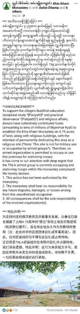 “ခမ်းချိုကျောင်း ၄.၇၅ဧက နယ်မြေနှင့် သာသနိက အဆောက်အဦ ကာလတန်ဖိုး (ကျပ်သိန်းထောင်ချီ) အကုန်ကျခံပြီး ကျေးရွာ၏ ပရိယတ္တိ ပဋိပတ္တိ သာသနာဟိတလုပ်ငန်းများဆောင်ရွက်နိုင်ရန် ရည်မှန်း၍ စုပေါင်းအလှူရှင်များမှ သာသနာနယ်မြေအဖြစ် လှူဒါန်းထားပြီးဖြစ်ပါသည်။ (လက်နက်ကိုင်များ တပ်စွဲ စခန်းချရန် စစ်မြေပြင်အသုံးပြုရန် မဟုတ်ပါ)။ သို့ဖြစ်ပါ၍ မည်သည့်လက်နက်ကိုင်အဖွဲ့အစည်းမှ တပ်ဆွဲတည်းခို နေရာပေးခြင်း ခွင့်မပြုခဲ့ပါ။ လက်ရှိတွင် TNLAလက်နက်ကိုင်အဖွဲ့အစည်းမှ ကျောင်းတွင်းတပ်စွဲစခန်းချ နေရာယူနေခြင်း ကြားသိရသည်ကို များစွာစိတ်မကောင်းဖြစ်မိပါသည် ခွင့်ပြုနိုင်ခြင်းမရှိပါကြောင်းနှင့် နောက်နောင်ဖြစ်ပေါ်လာသော ပြဿနာများကိုလည်း ကျောင်းနှင့်ပတ်သက်မှုမရှိကြောင်း ပျက်စီးဆုံးရှူံးမှုများရှိခဲ့ပါက သက်ဆိုင်ရာအဖွဲ့အစည်း၏ တာဝန်ဖြစ်သည်ဟု သိရှိနိုင်ပါရန် မေတ္တာရပ်ခံ ကြေညာအပ်ပါသည်။”ဟု ခမ်းချိုကျောင်းတိုက်က မြန်မာ၊ အင်္ဂလိပ်၊ တရုတ် သုံးဘာသာဖြင့် အသိပေးထားသည်။
