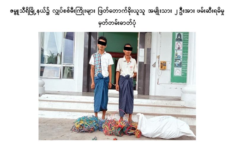 နေပြည်တော်ပြည်ထောင်စုနယ်မြေ၊ ဇမ္ဗူသီရိမြို့နယ်၌ ဇွန်လ ၁၄ ရက်နေ့က လျှပ်စစ်မီးကြိုးများ ဖြတ်တောက်ခိုးယူသူ အမျိုးသား ၂ ဦးအား ဖမ်းဆီးအရေးယူထားကြောင်း သိရသည်။