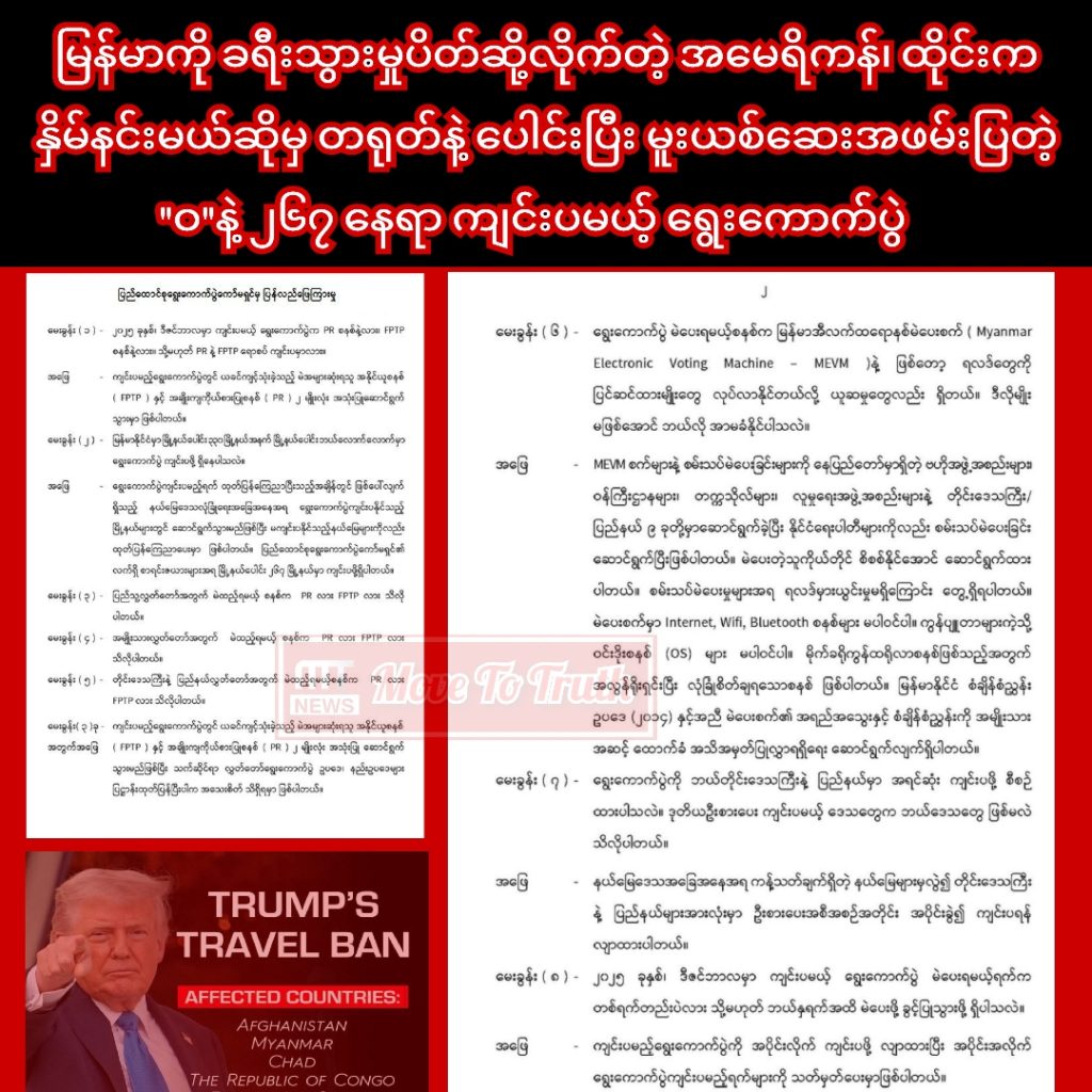 ဒါ့အပြင်လည်း TNLA က ကျားဖြန့်လုပ်ကိုင်သူ တရုတ် ၁၂ ဦးကို ဖမ်းဆီးပြီး တရုတ်ရဲတပ်ဖွဲ့ထံ လွှဲပြောင်းလိုက်တယ်ဆိုတဲ့ဖြစ်စဥ်တွေ၊ တပ်မတော်(လေ)က တိုက်ခိုက်ရေးလေယာဉ်တစ်စီး လေ့ကျင့်ပျံသန်းနေချိန် စက်ချို့ယွင်း ပျက်ကျကာမီးလောင်မှုဖြစ်ပွားခဲ့တာကို PDF တွေက ပစ်ချတာပါလို့ လိမ်လည် ပွဲခံတာတွေ၊ ရခိုင်လက်နက်ကိုင် AA အဖွဲ့နဲ့ အတူနေသူ အမျိုးသားက အသက် ၉ နှစ်အရွယ် မိန်းကလေးငယ်ကို သက်ငယ်မုဒိမ်းပြုကျင့်ပြီး ရက်ရက်စက်စက် သတ်ဖြတ်မှုမှာ ပူးပေါင်းပါဝင်သူ ၈ ဦးကို ဖမ်းဆီးထားတယ်လို့ AA ပြောခွင့်ရ ခိုင်သုခ ဝန်ခံထုတ်ပြောလာတာတွေ၊ ကိုးကန့် MNDAA အဖွဲ့က ကွတ်ခိုင်နယ် သာသနာ့မြေမှာ စစ်ဆေးရေးဂိတ် ဆောက်လုပ်နေလို့ ဒေသခံတွေ မကျေနပ် ဖြစ်နေရတာတွေ၊ AA နဲ့ NUG ဩဇာခံ MTC/MDF က အသက် ၄၅ နှစ်အောက် မရာချင်းလူမျိုးတိုင်း စစ်မှုထမ်းရမယ် အမိန့်ထုတ်လိုက်တာကြောင့် မရာချင်းလူငယ်တွေ ထွက်ပြေးနေရတဲ့ဖြစ်စဥ်တွေရှိပေမဲ့ ဒီတစ်ပတ်ရဲ့ နိုင်ငံရေးသုံးသပ်ချက်ကိုတော့ မြန်မာကို ခရီးသွားမှုပိတ်ဆို့လိုက်တဲ့ အမေရိကန်နိုင်ငံအကြောင်း၊ ထိုင်းနိုင်ငံက နှိမ်နင်းမယ်ဆိုမှ တရုတ်နဲ့ ပူးပေါင်းပြီး မူးယစ်ဆေးဖမ်းဆီးပြတဲ့ “ဝ”နဲ့ လာမယ့် ဒီဇင်ဘာမှာ ကျင်းပမယ့် ရွေးကောက်ပွဲကို FPTP ရော၊ PR စနစ်နဲ့ရော လုပ်ဆောင်ပြီး ၂၆၇ နေရာ ကျင်းပမယ်ဆိုတဲ့အကြောင်းတွေကို သုံးသပ်ချင်ပါတယ်။