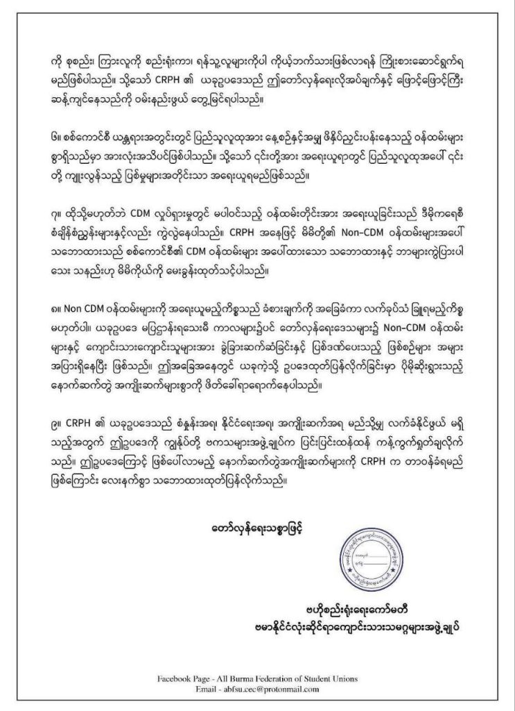NLD ၏ CEC ဟောင်း ဦးအောင်ကြည်ညွန့်ဦးဆောင်သော ပြည်ထောင်စုလွှတ်တော် ကိုယ်စားပြုကော်မတီ (CRPH) သည် “အကြမ်းမဖက်အာဏာဖီဆန်ရေး လှုပ်ရှားမှုဆိုင်ရာ နိုင်ငံ့ဝန်ထမ်းဥပဒေ” ကို ၂၀၂၅ ခုနှစ်၊ ဇွန်လ ၁၃ ရက်နေ့တွင် ထုတ်ပြန်ခဲ့ပြီး အဆိုပါ ဥပဒေတွင် CRPH, NUG နှင့် PDF တို့ကို လက်မခံသည့် လက်ရှိတာဝန်ထမ်းဆောင်နေသော နိုင်ငံ့ဝန်ထမ်းများကို အရေးယူမည်ဆိုသည့်အပေါ် ဗမာနိုင်ငံလုံးဆိုင်ရာကျောင်းသားသမဂ္ဂများအဖွဲ့ချုပ်(ဗကသ)က ပြင်းပြင်းထန်ထန်ရှုတ်ချလိုက်ပြီး လက်ခုပ်သံချူသည့် CRPH က ဖြစ်လာသမျှ အကျိုးဆက် တာဝန်ခံရမည်ဟုပါ သတိပေးလိုက်သည်။