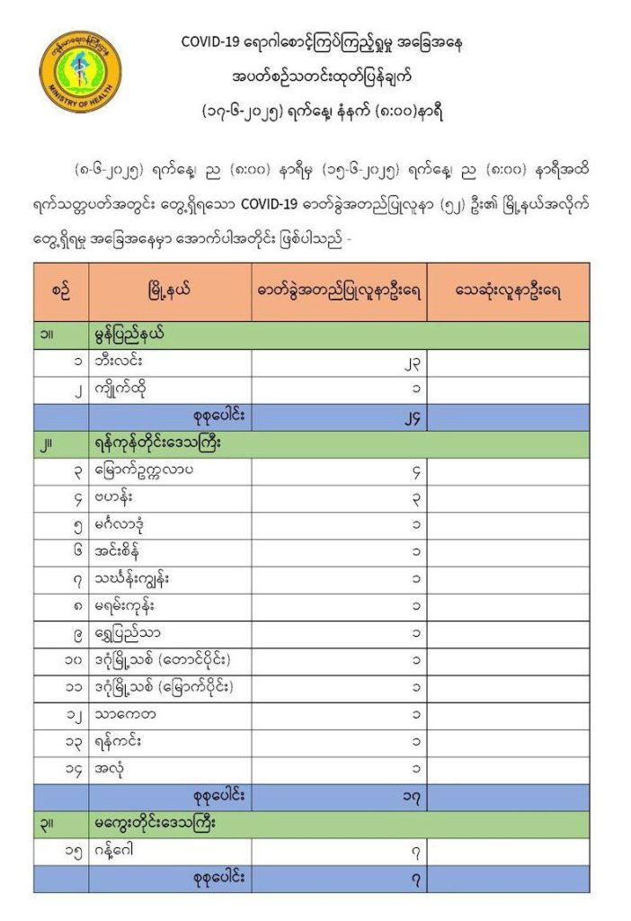 ဇွန်လ ၈ ရက်နေ့ကနေ ၁၅ ရက်နေ့အထိ ရက်သတ္တပတ်အတွင်း ကိုဗစ် -၁၉ ရောဂါ ဓာတ်ခွဲအတည်ပြုလူနာသစ် ၅၂ ဦးအထိ တွေ့ရှိထားသော်လည်း ပြင်းထန်လူနာ၊ အထူးကြပ်မတ် ကုသမှုပေးရသောလူနာနှင့် ကိုဗစ်-၁၉ ရောဂါဖြင့်သေဆုံးလူနာ မရှိကြောင်း COVID-19 ရောဂါ စောင့်ကြပ်ကြည့်ရှုမှုနှင့်ပတ်သက်၍ အပတ်စဉ် သတင်းထုတ်ပြန်ချက်အဖြစ် ယမန်နေ့ ဇွန်လ ၁၆ ရက် ည ၈ နာရီအချိန်တွင် ကျန်းမာရေးဝန်ကြီးဌာနမှ သတင်းထုတ်ပြန်ထားသည်။