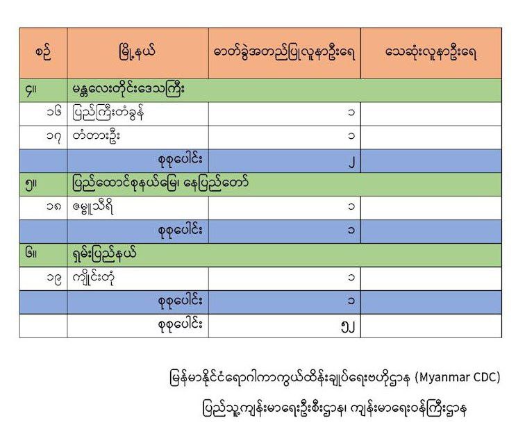 ဓာတ်ခွဲအတည်ပြုလူနာများမှာ မွန်ပြည်နယ် မှ ၂၄ ဦး ၊ ရန်ကုန်တိုင်းမှ ၁၇ ဦး၊ မကွေးတိုင်းမှ ၇ ဦး၊ မန္တလေးတိုင်းမှ ၂ ဦး၊ နေပြည်တော် မှ ၁ ဦး၊ ရှမ်းပြည်နယ်မှ ၁ ဦးတို့ဖြစ်ကြောင်း သိရသည်။