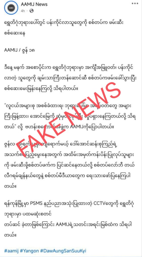 အင်္ကျီအဖြူဝတ်ထားပြီး ပန်းစည်းတွေကိုင်လာတဲ့ လူငယ်တွေကို ရွှေတိဂုံစေတီတော် ရာဟုထောင့်အောင်မြေနဲ့ ချမ်းသာကြီးတန်ဆောင်းထဲမှာ အရပ်ဝတ်လုံခြုံရေးအဖွဲ့က စစ်ဆေးနေတယ်လို့ ဗဟန်းကင်းထောက်ကအဖွဲ့က စတင်ပြီး သတင်းအမှားထုတ်လွှင့်ခဲ့တာပါ။