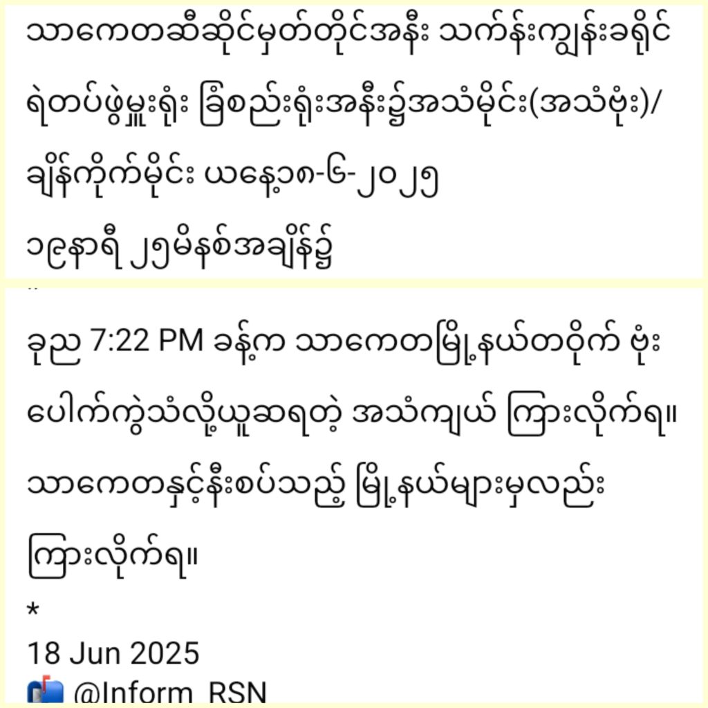 ယနေ့ ဇွန်လ ၁၈ ရက် ည ၇ နာရီ မိနစ် ၂၀ ခန့်က ပေါက်ကွဲခဲ့ခြင်းဖြစ်ပြီး အသံကျယ်လောင်သည့်အတွက် ရပ်ကွက်နေသူများ ထိတ်လန့် စိုးရိမ်စိတ်များ ဖြစ်ပေါ်ခဲ့ကြရခြင်းဖြစ်ကြောင်း သိရသည်။