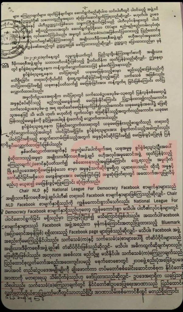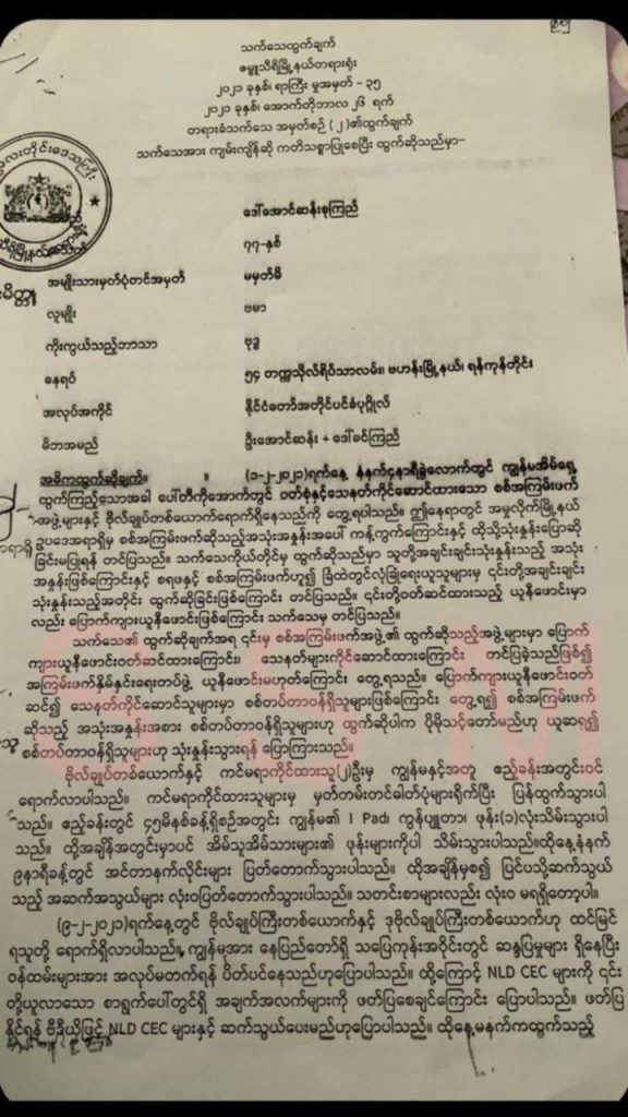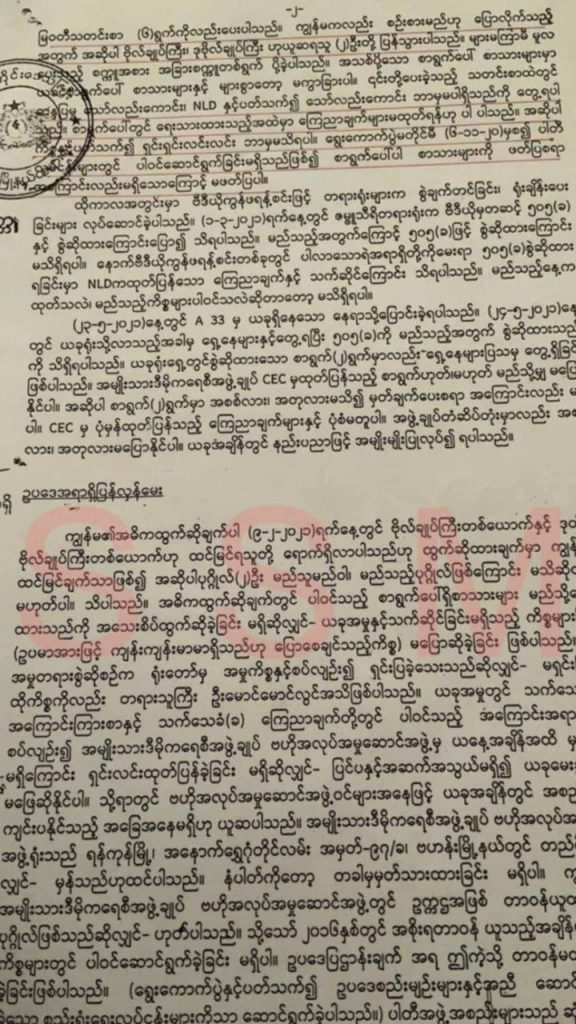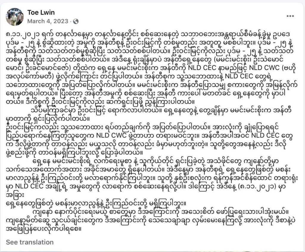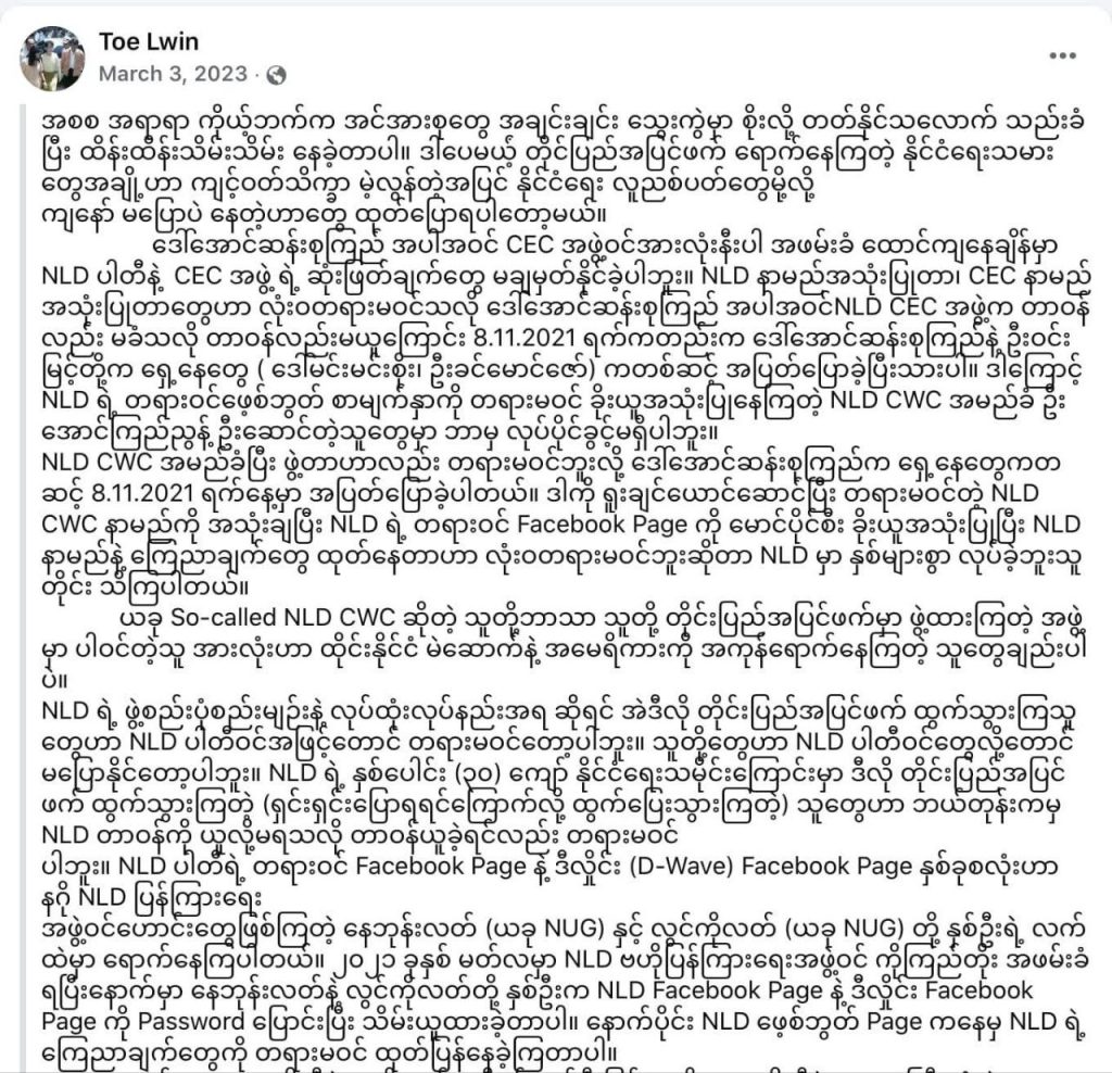 ”ရှေ့နေ မမင်းမင်းစိုးရဲ့ လက်ရေးမူစာနဲ့ သူကိုယ်တိုင် ရှင်းပြခဲ့တဲ့ အသံဖိုင်တွေ၊ အထောက်အထားတွေ အခိုင်အမာ ရှိနေပါတယ်။ အဲဒီနေ့မှာ အန်တီစုရဲ့ ရှေ့နေတွေဖြစ်တဲ့ မစန်းမာလာညွန့်နဲ့ ဦးကြည်ဝင်းတို့ မလာကြပါဘူး။ သူတို့ နှစ်ဦးစလုံးက ရန်ကုန် အင်းစိန်ထောင် တရားရုံးမှာ NLD CEC အချို့ရဲ့ အမှုတွေကို သွားရောက်စစ်ဆေးနေပါတယ်။ ဒေါ်အောင်ဆန်းစုကြည် အပါအဝင် CEC အဖွဲ့ဝင်အားလုံးနီးပါ အဖမ်းခံ ထောင်ကျနေချိန်မှာ NLD ပါတီနဲ့ CEC အဖွဲ့ရဲ့ ဆုံးဖြတ်ချက်တွေ မချမှတ်နိုင်ခဲ့ပါဘူး။ NLD နာမည်အသုံးပြုတာ၊ CEC နာမည် အသုံးပြုတာတွေဟာ လုံးဝတရားမဝင်သလို ဒေါ်အောင်ဆန်းစုကြည် အပါအဝင် NLD CEC အဖွဲ့က တာဝန်လည်း မခံသလို တာဝန်လည်းမယူကြောင်း၊ NLD CWC အမည်ခံပြီး ဖွဲ့တာဟာလည်း တရားမဝင်ဘူးလို့ ရှေ့နေတွေကတစ်ဆင့် အပြတ်ပြောခဲ့ပါတယ်။ ဒါကြောင့် NLD ရဲ့ တရားဝင်ဖေ့စ်ဘွတ် စာမျက်နှာကို တရားမဝင် ခိုးယူအသုံးပြုနေကြတဲ့ NLD CWC အမည်ခံ အောင်ကြည်ညွန့် ဦးဆောင်တဲ့သူတွေမှာ ဘာမှ လုပ်ပိုင်ခွင့်မရှိပါဘူး။ အဲ့ဒါကို ရူးချင်ယောင်ဆောင်ပြီး တရားမဝင်တဲ့ NLD CWC နာမည်ကို အသုံးချပြီး NLD ရဲ့ တရားဝင် Facebook Page ကို မောင်ပိုင်စီး ခိုးယူအသုံးပြုပြီး NLD နာမည်နဲ့ ကြေညာချက်တွေ ထုတ်နေတာဟာ လုံးဝတရားမဝင်ဘူးဆိုတာ NLD မှာ နှစ်များစွာ လုပ်ခဲ့ဘူးသူတိုင်း သိကြပါတယ်။ ယခု So-called NLD CWC ဆိုတဲ့ သူတို့ဘာသာ သူတို့ တိုင်းပြည်အပြင်ဘက်မှာ ဖွဲ့ထားကြတဲ့ အဖွဲ့မှာ ပါဝင်တဲ့သူ အားလုံးဟာ ထိုင်းနိုင်ငံ မဲဆောက်နဲ့ အမေရိကားမှာ ရောက်နေသူတွေ ဖြစ်ကြပါတယ်လို့ ကိုတိုးလွင်က ရေးသားခဲ့ပါတယ်။ ရှေ့နေ မမင်းမင်းစိုးရဲ့ လက်ရေးမူစာနဲ့ သူမကိုယ်တိုင် ရှင်းပြခဲ့တဲ့ အခြေအနေ အချက်အလက် အကြောင်းအရာများကို ဒေါ်အောင်ဆန်းစုကြည်နှင့် ဦးဝင်းမြင့်တို့၏ သဘောထားများအဖြစ် ပြည်ပရောက် အောင်ကြည်ညွန့်တို့အဖွဲ့ သိရှိရအောင် ကြားခံလူမှတစ်ဆင့် ၂၀၂၁ ခုနှစ် နိုဝင်ဘာလ ကုန်ခါနီးချိန်မှာ ပေးပို့ခဲ့ကြပါတယ်။ အဲ့ဒီလို ပြည်ပြေး အောင်ကြည်ညွန့်နဲ့ ကျော်ထွေးတို့ဆီ ပေးပို့လိုက်တဲ့ ဒေါ်အောင်ဆန်းစုကြည်နှင့် ဦးဝင်းမြင့်တို၏ သဘောထားများစာကို ရက်ပိုင်းအတွင်းမှာပဲ D-Wave FaceBook Page ကနေ ၃၀.၁၁.၂၀၂၁ ရက်နေ့မှာ “ဂျင်းသတင်း” ဖြစ်ကြောင်း နေဘုန်းလတ်တို့အဖွဲ့က ယုတ်မာစွာ လိမ်ညာပြီး ပို့စ်တင်ခဲ့ပါတယ်။ NLD ပါတီရဲ့ တရားဝင် Facebook Page နဲ့ ဒီလှိုင်း (D-Wave) Facebook Page နှစ်ခုစလုံးဟာ NLD ပြန်ကြားရေးအဖွဲ့ဝင်ဟောင်းတွေဖြစ်ကြတဲ့ နေဘုန်းလတ် (ယခု NUG) နှင့် လွင်ကိုလတ် (ယခု NUG) တို့နှစ်ဦးရဲ့ လက်ထဲမှာ ရောက်နေကြပါတယ်”လို့လည်း San Maw အကောင့်ကတစ်ဆင့် ဒေါ်စန်းစန်းမော်က ဖွင့်ချခဲ့ပါတယ်။