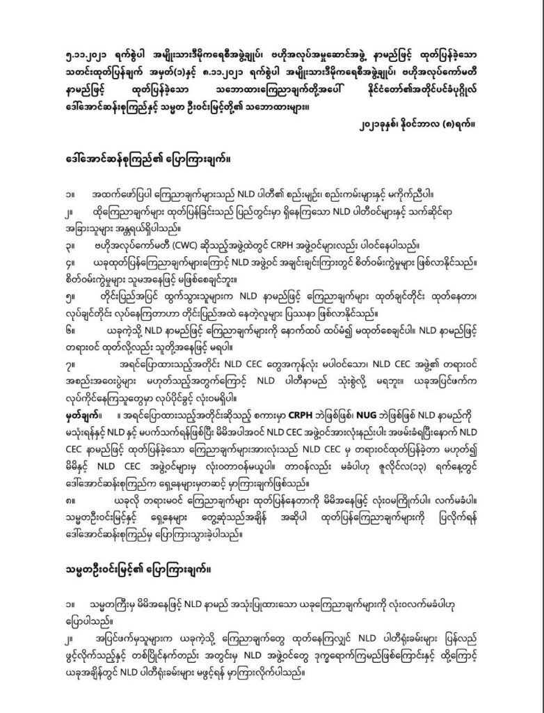 ◾️ NUG နှင့် PDF ကို မွေးဖွားသူ CRPH ဥက္ကဌ ဦးအောင်ကြည်ညွန့်ဦးဆောင်သော NLD CWC အဖွဲ့နှင့် ယင်းတို့၏ လုပ်ရပ်အားလုံးမှာ ဒေါ်အောင်ဆန်းစုကြည်နှင့် ဦးဝင်းမြင့်တို့ မသိသလို NLD ပါတီနှင့်ပါ မသက်ဆိုင်ကြောင်း ပြောသည်ကိုပင် နေဘုန်းလတ်က ယုတ်မာစွာဖြင့် ဂျင်းသတင်းဆိုကာ ပုံဖျက်ခဲ့