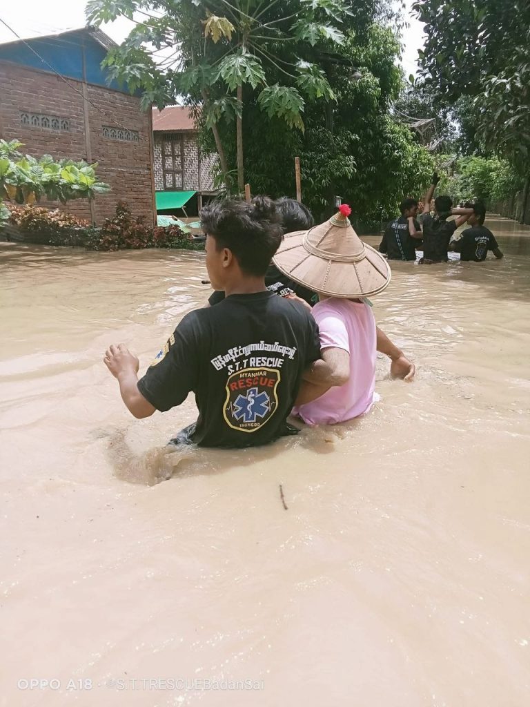ဒီနေ့ ဇွန်လ ၂၀ ရက် မနက် ဆယ်နာရီခန့်မှာ တောင်ငူမြို့ ၁၁ ရပ်ကွက် နယ်မြေ ၉ ရှိ ဆင်ခြေဖုံးရပ်ကွက်တွေထဲ ခပေါင်းချောင်းရေကြီးရေလျှံမှူကြောင့် ရုတ်တရက်ရေဝင်ရောက်လာလို့ ပြည်သူတွေဘေးလွတ်ရာဆီ မြန်မာနိုင်ငံ လူမှူကယ်ဆယ်ရေးအဖွဲ့ S.T.T RESCUEတောင်ငူက ကယ်ဆယ်ပေးနေပါတယ်။