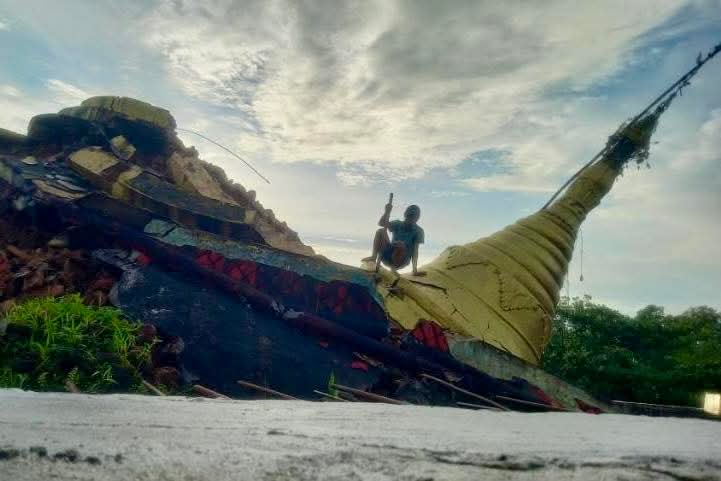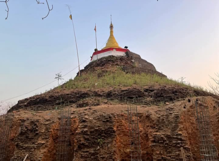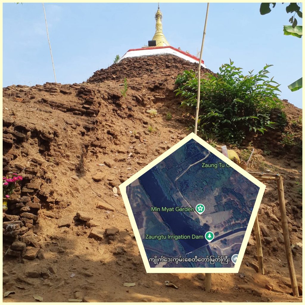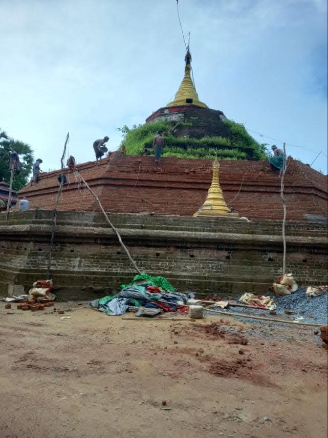 ပုံစာ။ ကျိုက်ဒေးကွမ်းစေတီတော်မြတ်ကြီး ပြုပြင်နေမှုပုံနှင့် ယနေ့ ပြိုကျမှုမြင်ကွင်း (ဓာတ်ပုံ – သက်ဖြိုးကြိုင်၊ CJ)