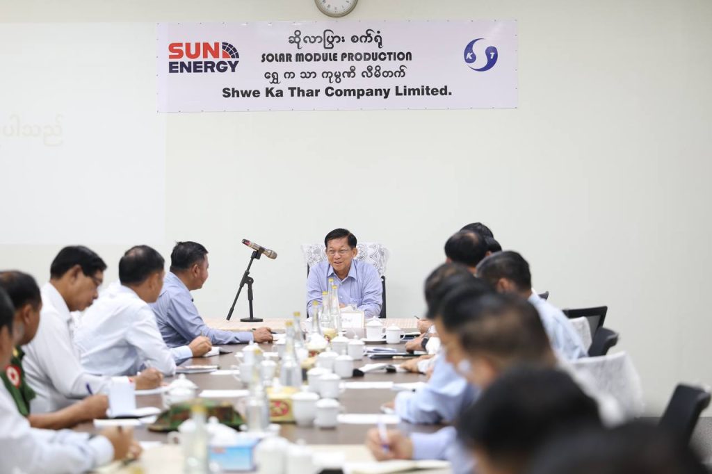 ပြည်တွင်း ထုတ်လုပ်သည့် ဆိုလာပြားများအား ပြည်ပမှ တင်သွင်းသည့် ဆိုလာပြားများနှင့် တန်းတူ အရည်အသွေးရရှိအောင် ဆောင်ရွက်ရန် နိုင်ငံတော်စီမံအုပ်ချုပ်ရေးကောင်စီ (SAC) ဥက္ကဋ္ဌ ဗိုလ်ချုပ်မှူးကြီးမင်းအောင်လှိုင်က ယနေ့တွင် ရန်ကုန်တိုင်းဒေသကြီးအတွင်း စက်ရုံအလုပ်ရုံများ၌ ကုန်ထုတ်လုပ်မှုတိုးမြှင့်ရေး ဆောင်ရွက်နေမှုများအား သွားရောက်ကြည့်ရှု့စစ်ဆေးစဉ် ပြောကြားသည်။