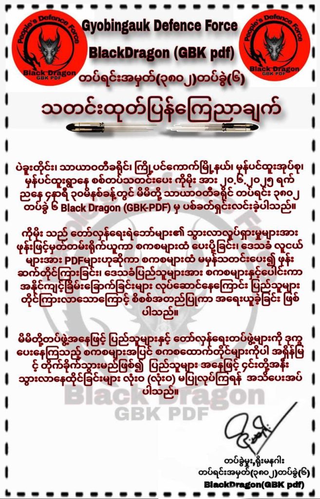 အသက် ၆၀ ခန့် သက်ကြီးပိုင်း အမျိုးသားတစ်ဦးကို စစ်တပ်သတင်းပေးဟု စွပ်စွဲကာ သာယာဝတီ PDF အဖွဲ့ဖြစ်သော သာယာဝတီခရိုင် တပ်ရင်း ၃၈၀၂ တပ်ခွဲ ၆ Black Dragon (GBK-PDF) က သတ်ဖြတ်လိုက်သည်ဟု ကျူးလွန်သည့် PDF များက ယနေ့ဝန်ခံသည်။