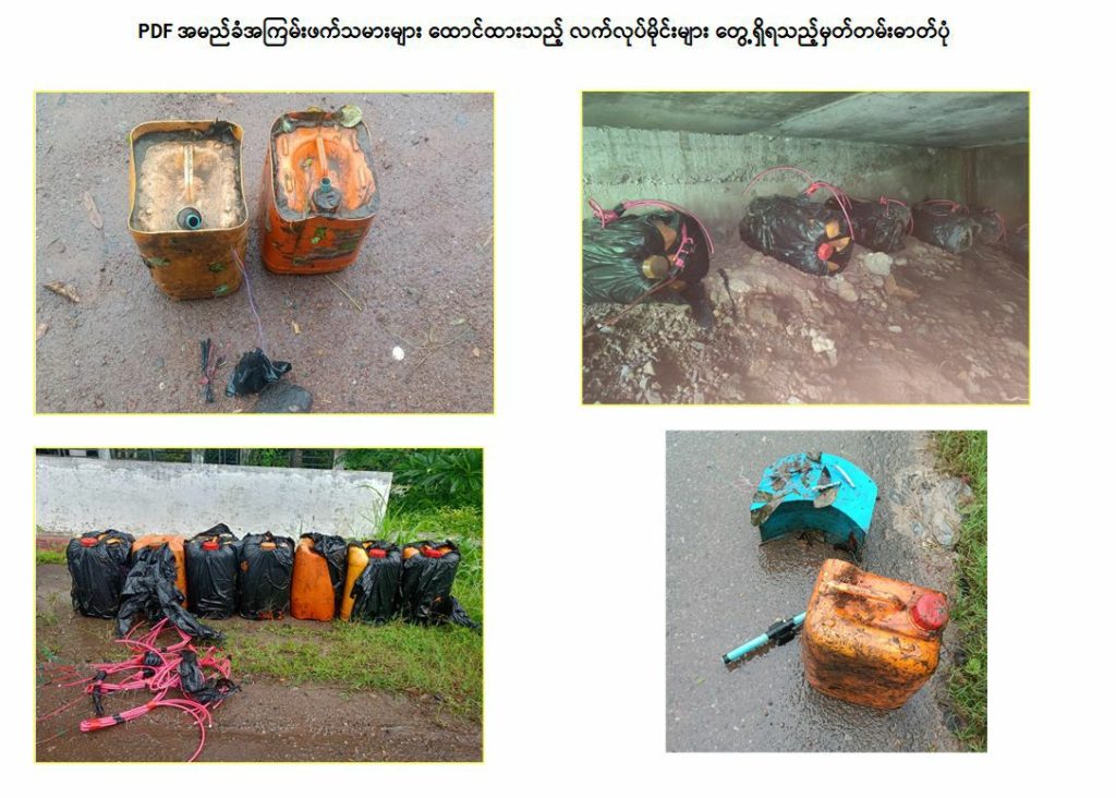 PDF များအနေဖြင့် အများပြည်သူများ အထိတ်တလန့်ဖြစ်စေရန်၊ လမ်းပန်းဆက်သွယ်မှု ပြတ်တောက်စေရန်နှင့် ကုန်စည်စီးဆင်းမှုများ အခက်အခဲဖြစ်ပေါ်စေရန် စသည့် ရည်ရွယ်ချက်များဖြင့် အများပြည်သူသွားလာအသုံးပြုလျက်ရှိသော လမ်း၊ တံတားများအား မိုင်းထောင်ဖောက်ခွဲခြင်း၊ အကြမ်းဖက်တိုက်ခိုက်ခြင်း စသည်များကို ဆင်ခြင်တုံတရားကင်းမဲ့စွာ လုပ်ဆောင်လျက်ရှိရာ ယခုလည်း ကျိုက်ထိုမြို့အနီး ရန်ကုန်- မော်လမြိုင်သွား ပြည်ထောင်စုကားလမ်းမကြီးပေါ်၌ PDF များက လက်လုပ်မိုင်းများထောင်ထားသဖြင့် လုံခြုံရေးတပ်ဖွဲ့ဝင်များက ရှင်းလင်းခဲ့ရပြန်သည်။