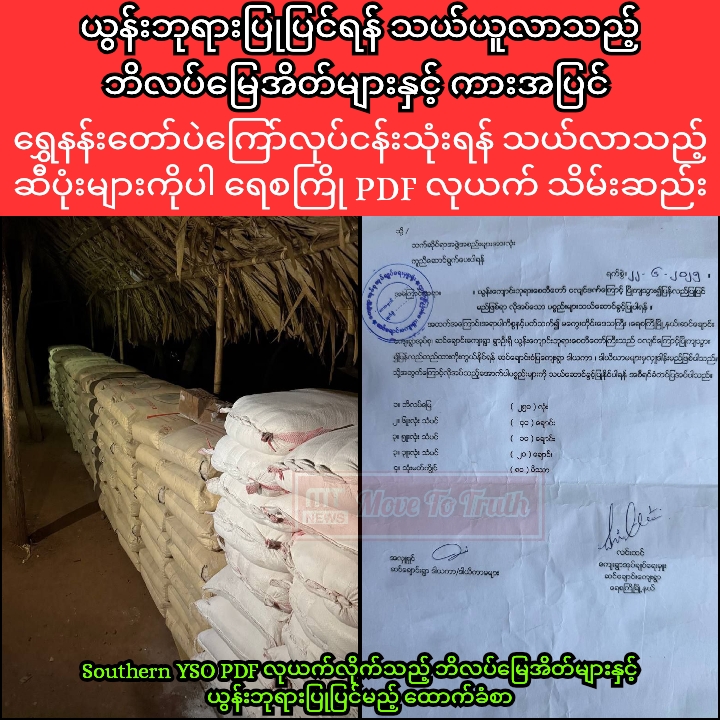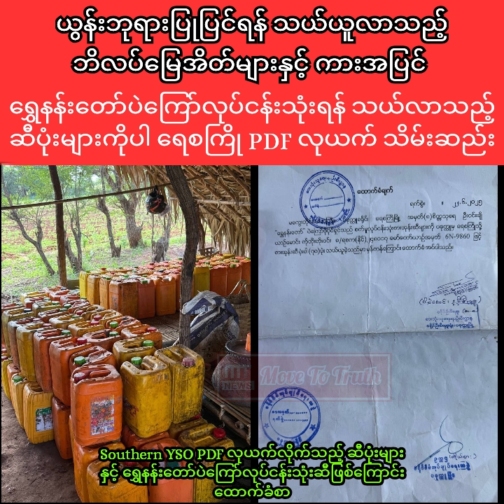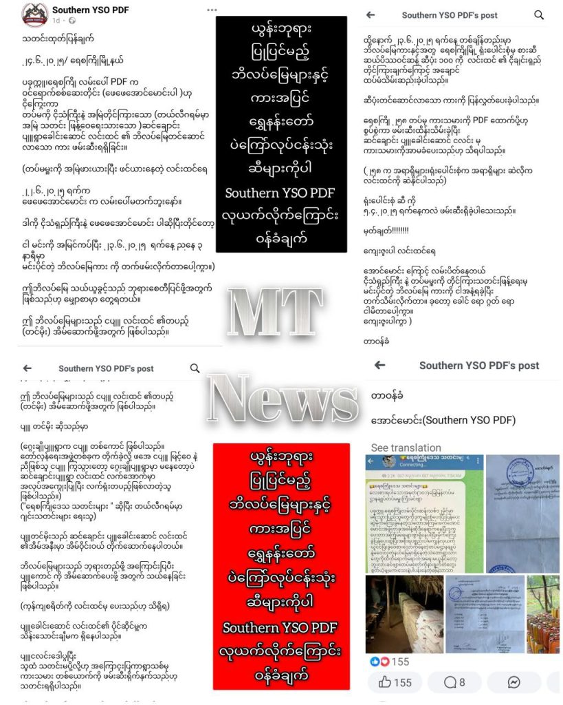 ရေစကြိုမြို့နယ်၊ ဆင်ချောင်းရွာရှိ ယွန်းဘုရားပြုပြင်ရန် သယ်ယူလာသည့် ဘိလပ်မြေအိတ်များနှင့် ကားအပြင် ရွှေနန်းတော်ပဲကြော်လုပ်ငန်းသုံးရန် သယ်လာသည့် ဆီပုံးများကိုပါ ရေစကြို PDF အဖွဲ့က လုယက် သိမ်းဆည်းလိုက်သည်ဟု ကျူးလွန်သည့် Southern YSO PDF အဖွဲ့က ဝန်ခံထားသည်။