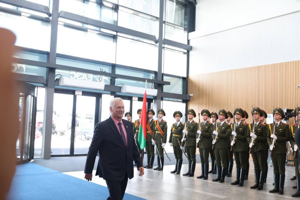 အခမ်းအနား တက်ရောက်ရန် Minsk International Exhibition Center BELEXPO သို့ ရောက်ရှိလာကြသည့် SAC ဥက္ကဋ္ဌ နိုင်ငံတော်ဝန်ကြီးချုပ် ဗိုလ်ချုပ်မှူးကြီးမင်းအောင်လှိုင်၊ ရုရှားနိုင်ငံသမ္မတ ဗလာဒီမာပူတင်နှင့် အဖွဲ့ဝင်နိုင်ငံ၊ မိတ်ဖက်နိုင်ငံအသီးသီးမှ နိုင်ငံ့အကြီးအကဲများအား ဘယ်လာရုစ်သမ္မတနိုင်ငံ သမ္မတ H.E. Mr. Alexander Grigoryevich Lukashenko က ကြိုဆိုနှုတ်ဆက်ခဲ့သည်။