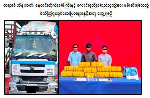 စစ်ဆေးဖော်ထုတ်ချက်အရ ဖမ်းဆီးရမိ စိတ်ကြွရူးသွပ်ဆေးပြားများအား ရန်ကုန်မှတစ်ဆင့်ထားဝယ်သို့ သယ်ဆောင်ရောင်းဝယ်ခြင်းဖြစ်ကြောင်း သိရှိရသဖြင့် ၎င်းတို့ သုံးဦးအား ဥပဒေအရ အရေးယူထားရှိပြီး ကွင်းဆက်ပြစ်မှု ကျူးလွန်သူများအား ဆက်လက်ဖော်ထုတ်လျက် ရှိကြောင်း မြန်မာနိုင်ငံရဲတပ်ဖွဲ့မှ သတင်းရရှိသည်။