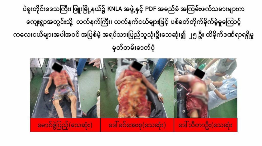 ပဲခူးတိုင်းဒေသကြီး၊ ဖြူးမြို့နယ်၌ KNU/ KNLA နှင့် PDF များက ကျေးရွာအတွင်းသို့ လက်နက်ကြီး၊ လက်နက်ငယ်များဖြင့် ပစ်ခတ်တိုက်ခိုက်ခဲ့မှုကြောင့် ကလေးငယ်များအပါအဝင် အပြစ်မဲ့ အရပ်သားပြည်သူသုံးဦးသေဆုံး၍ လသားကလေးငယ်နှစ်ဦးအပါအဝင် ၂၅ ဦး ထိခိုက်ဒဏ်ရာရရှိခဲ့မှု ယမန်နေ့က ဖြစ်ပွားခဲ့သည်။