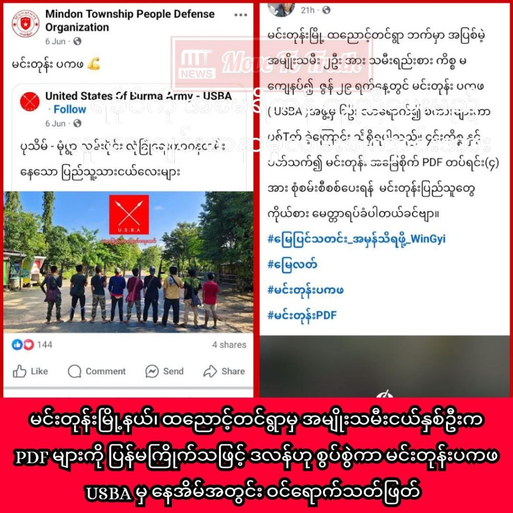 မင်းတုန်းမြို့နယ်၊ ထညောင့်တင်ကျေးရွာနေ ဒေါ်စန္ဒာဝင်း(၂၈)နှစ်နှင့် ၎င်း၏ညီမဖြစ်သူ မချောရတနာ(၁၈)နှစ်တို့ နှစ်ဦးကို မင်းတုန်း PDF များအား ပြန်မကြိုက်မှုဖြင့် မင်းတုန်း ပကဖ (USBA )အဖွဲ့မှ PDF ၆ ဦးက ပစ်သတ်သည့်အပေါ် MT News က ကိုဗဟိန်း (ခ) ပိုင်ဖြိုး(ခ) ဖြိုးသူကျော်နှင့် USBA အဖွဲ့ကို ဆက်သွယ်မေးမြန်းထားပြီး ဖြေဆိုလာပါက ဆက်လက်ဖော်ပြပေးမည်ဖြစ်သည်။