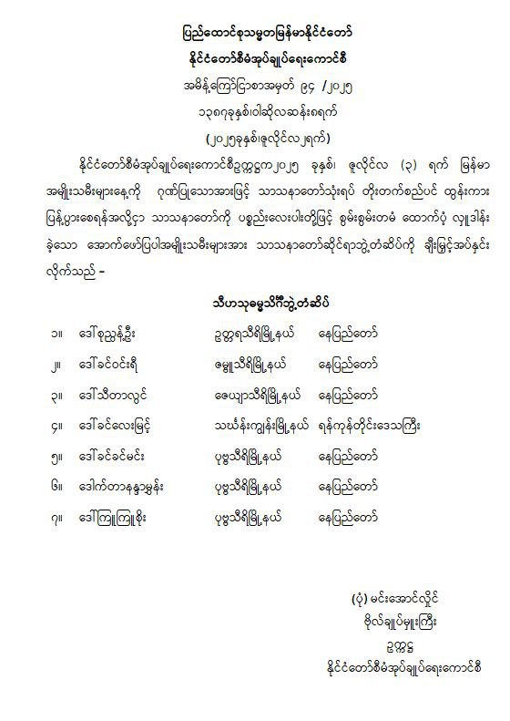 သာသနာတော်သုံးရပ် တိုးတက်စည်ပင် ထွန်းကားပြန့်ပွားစေရန်အလို့ငှာ သာသနာတော်ကို ပစ္စည်းလေးပါးတို့ဖြင့် စွမ်းစွမ်းတမံ ထောက်ပံ့လှူဒါန်းခဲ့သော အမျိုးသမီး ၇ ဦးအား သီဟသုဓမ္မသိင်္ဂီဘွဲ့တံဆိပ်အား ပေးအပ်ချီးမြှင့်ကြောင်း နိုင်ငံတော်စီမံအုပ်ချုပ်ရေးကာင်စီသည် အမိန့်ကြော်ငြာစာအမှတ် (၉၄/၂၀၂၅) ဖြင့် ဇူလိုင်လ ၂ ရက်တွင် ထုတ်ပြန်ထားသည်။