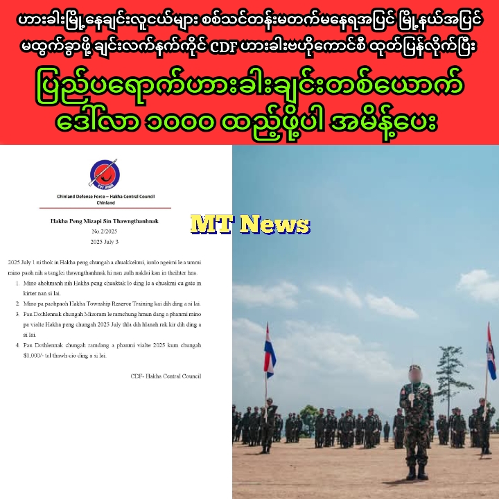 ဒါ့အပြင် နွေဦးတော်လှန်ရေးကာလမှာ နိုင်ငံခြားရောက်ရှိသူ ဟားခါးချင်းအားလုံး ၂၀၂၅ ခုနှစ်အတွင်း အမေရိကန်ဒေါ်လာ ၁၀၀၀ စီ ရန်ပုံငွေထည့်ဝင်ကြရမယ်လို့လည်း ချင်းလက်နက်ကိုင် CDF ဟားခါးဗဟိုကောင်စီက အမိန့်စာထုတ်ပြန်ထားပါတယ်။