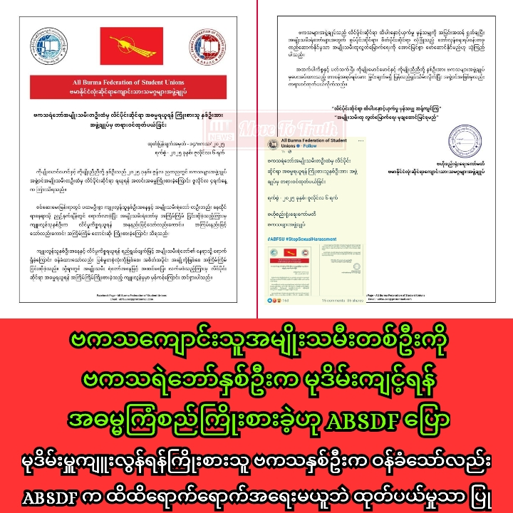 ◾ မုဒိမ်းမှူကျူးလွန်ရန်ကြိုးစားသူ ဗကသနှစ်ဦးက ဝန်ခံသော်လည်း ABSDF က ထိထိရောက်ရောက်အရေးမယူဘဲ ထုတ်ပယ်မှုသာ ပြု