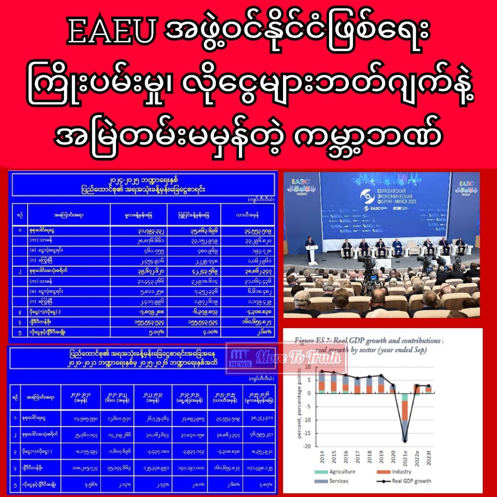 EAEU အဖွဲ့ဝင်နိုင်ငံအဖြစ် SAC ဥက္ကဋ္ဌတောင်းဆိုသလို တကယ်မဖြစ်လာခင်မှာကို လက်ရှိပူးပေါင်းဆောင်ရွက်မှုတွေနဲ့တင် EAEU နိုင်ငံတွေဖြစ်တဲ့ ရုရှား၊ ဘယ်လာရုစ်၊ ကာဇက်စတန်၊ ကာဂျစ်စတန်၊ အာမေးနီးယား စတဲ့နိုင်ငံတွေဟာ မြန်မာ့ကုန်ပစ္စည်းတွေအတွက် အလားအလာရှိတဲ့ ဈေးကွက်သစ်တွေ ဖြစ်လာနိုင်မှာပါ။ ဒါဟာ EU နဲ့ အမေရိကန်အပါအဝင် အနောက်နိုင်ငံတွေရဲ့ ပိတ်ဆို့အရေးယူမှုများစွာကြောင့် အခက်အခဲကြုံနေရတဲ့ မြန်မာ့ပို့ကုန်တွေကို EAEU နိုင်ငံတွေဆီ တင်ပို့တာ၊ ဒီနိုင်ငံတွေက လာမြှုပ်နှံတာဟာ စီးပွားရေးပိတ်ဆို့မှု ဖိအားတွေကို လျှော့ချနိုင်မှာဖြစ်သလို စွမ်းအင်၊ သတ္တုနဲ့ စိုက်ပျိုးရေး ထုတ်ကုန်တွေအတွက် အခွင့်အလမ်းများစွာ ပေါ်ထွက်လာနိုင်တာကလည်း အမှန်ပါပဲ။ လက်ရှိမှာဆိုရင်လည်း မြန်မာနိုင်ငံနဲ့ EAEU ကုန်သွယ်မှုကဏ္ဍက ၂၀၁၉ ခုနှစ်ကစ သုံးဆတိုးလာပြီး ဒေါ်လာ ၁ ဒသမ ၅ ဘီလျံရှိလာပြီဖြစ်လို့ EAEU ထိပ်သီးအစည်းအဝေးဟာ မြန်မာနိုင်ငံအတွက် အကျိုးရှိခဲ့တယ်လို့ ပြောရမှာဖြစ်ပြီး ရုရှားနဲ့ လုပ်ဆောင်မယ့် ထားဝယ်အထူးစီးပွားရေးဇုန်မှာ ဒီနိုင်ငံတွေ လာမြှုပ်နှံဖို့ ဆွဲဆောင်ရာမှာလည်း အကျိုးဖြစ်ထွန်းစေမှာဖြစ်ပါတယ်။ သေချာတာကတော့ မြန်မာပြည်သူတွေကို ပြာပုံထဲတိုးစေဖို့နဲ့ အခက်အခဲအမျိုးမျိုးကြုံစေဖို့ အမေရိကန်၊ EU နဲ့ ILO ပိတ်ဆို့မှုတွေကို ထိုင်ငိုနေမယ့်အစား၊ အသနားခံနေမယ့်အစား တစ်ဖက်ကလည်း ဒီလို တစ်ဖက်သတ် လုပ်ဆောင်ချက်တွေ ပြေလျော့ဖို့နဲ့ EAEU နိုင်ငံဖြစ်ဖို့၊ စျေးကွက်အသစ်ရှာဖို့ကြိုးစားရမှာ သဘာ၀ကျတဲ့ လုပ်ရပ်သာဖြစ်လို့ မြန်မာနိုင်ငံအဖို့တော့ SAC ဥက္ကဋ္ဌရဲ့ ဒီခရီးစဉ်ကလည်း အကျိုးသေချာပေါက်ဖြစ်ထွန်းခဲ့တဲ့ ခရီးစဉ်လို့ သုံးသပ်ရမှာပါ။