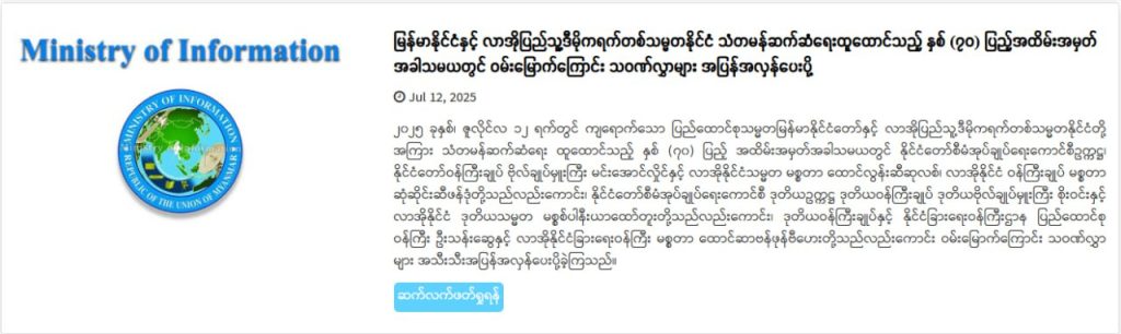 ၂၀၂၅ ခုနှစ်၊ ဇူလိုင်လ ၁၂ ရက်တွင် ကျရောက်သော ပြည်ထောင်စုသမ္မတမြန်မာနိုင်ငံတော်နှင့် လာအိုပြည်သူ့ဒီမိုကရက်တစ်သမ္မတနိုင်ငံတို့အကြား သံတမန်ဆက်ဆံရေး ထူထောင်သည့် နှစ် (၇၀) ပြည့် အထိမ်းအမှတ်အခါသမယတွင် SAC ဥက္ကဋ္ဌနှင့် လာအိုနိုင်ငံသမ္မတ မစ္စတာထောင်လွန်းဆီဆုလစ်၊ လာအိုနိုင်ငံဝန်ကြီးချုပ် မစ္စတာဆုံဆိုင်းဆီဖန်ဒုံတို့သည် ဝမ်းမြောက်ကြောင်း သဝဏ်လွှာများ အသီးသီးအပြန်အလှန်ပေးပို့ခဲ့ကြသည်။