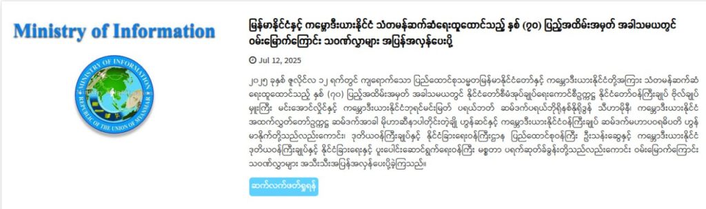 ၂၀၂၅ ခုနှစ် ဇူလိုင်လ ၁၂ ရက်တွင် ကျရောက်သော ပြည်ထောင်စုသမ္မတမြန်မာနိုင်ငံတော်နှင့် ကမ္ဘောဒီးယားနိုင်ငံတို့အကြား သံတမန်ဆက်ဆံရေးထူထောင်သည့် နှစ် (၇၀) ပြည့်အထိမ်းအမှတ် အခါသမယတွင် SAC ဥက္ကဋ္ဌနှင့် ကမ္ဘောဒီးယားနိုင်ငံဘုရင်မင်းမြတ် ပရယ်ဘတ် ဆမ်ဒက်ပရယ်ဘိုရိုနစ်နိုရိုဒွန် သီဟာမိုနီ၊ ကမ္ဘောဒီးယားနိုင်ငံ အထက်လွှတ်တော်ဥက္ကဋ္ဌ ဆမ်ဒက်အာခါ မိုဟာဆီနာပါတိုင်းတဲ့ချို ဟွန်ဆင်နှင့် ကမ္ဘောဒီးယားနိုင်ငံဝန်ကြီးချုပ် ဆမ်ဒက်မဟာပဝရဓိပတိ ဟွန်မာနိုက်တို့သည် ဝမ်းမြောက်ကြောင်း သဝဏ်လွှာများ အသီးသီးအပြန်အလှန်ပေးပို့ခဲ့ကြသည်။