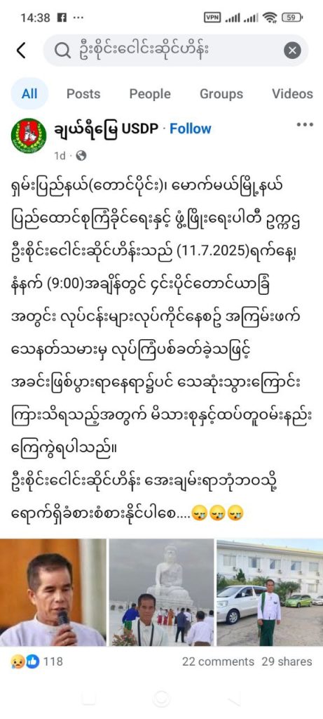 “ရှမ်းပြည်နယ်(တောင်ပိုင်း)၊ မောက်မယ်မြို့နယ် ပြည်ထောင်စုကြံခိုင်ရေးနှင့် ဖွံ့ဖြိုးရေးပါတီ ဥက္ကဋ္ဌဦးစိုင်းငေါင်းဆိုင်ဟိန်းသည် (၁၁. ၇. ၂၀၂၅) ရက်နေ့၊ နံနက် (၉) နာရီအချိန်တွင် ၎င်းပိုင်တောင်ယာခြံအတွင်း လုပ်ငန်းများလုပ်ကိုင်နေစဥ် အကြမ်းဖက်သေနတ်သမားမှ လုပ်ကြံပစ်ခတ်ခဲ့သဖြင့် အခင်းဖြစ်ပွားရာနေရာ၌ပင် သေဆုံးသွားကြောင်း ကြားသိရသည့်အတွက် မိသားစုနှင့်ထပ်တူဝမ်းနည်းကြေကွဲရပါသည်။ ဦးစိုင်းငေါင်းဆိုင်ဟိန်း အေးချမ်းရာဘုံဘဝသို့ ရောက်ရှိခံစားစံစားနိုင်ပါစေ…” ဟုလည်း ချယ်ရီမြေ USDP Page က အသိပေးထားသည်။
