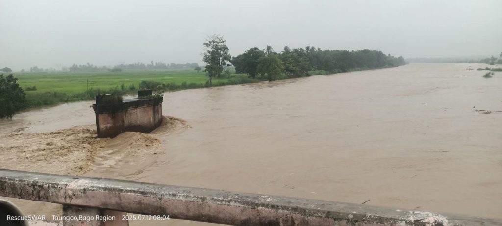ရန်ကုန်-မန္တလေး အမြန်လမ်းမကြီး မိုင်တိုင်အမှတ် (၁၆၉) မိုင်မှ (၁၇၆) မိုင်ကြား အမြန်လမ်းမကြီး မန္တလေး – ရန်ကုန်ဘက်အခြမ်းမှာ မနေ့က ဇူလိုင်၁၁ ရက်နေ့ညက မိုးသည်းထန်စွာရွာသွန်းခဲ့တဲ့အတွက် ဆွာချောင်းရေမြင့်တက်လာတာကြောင့် ချောင်းဘေးနေထိုင်တဲ့ လယ်စောင့်တဲနဲ့ အိမ်ခြေအနည်းငယ် ဘေးလွတ်ရာရွှေ့ပြောင်းပေးခဲ့ရတယ်လို့ ဒေသခံလူမှုကယ်ဆယ်ရေးအသင်းတချို့ထံကနေ သိရပါတယ်။