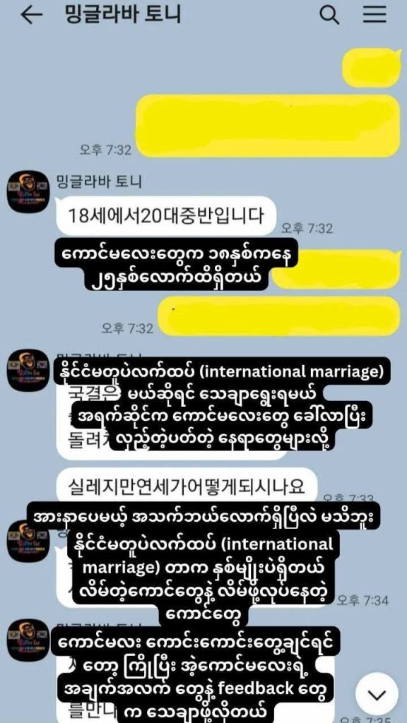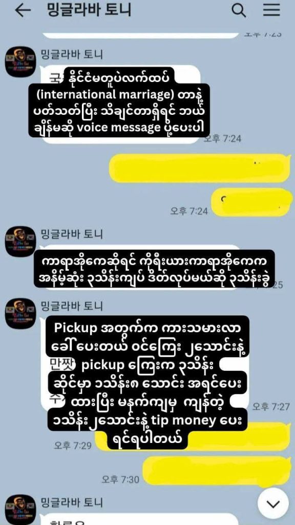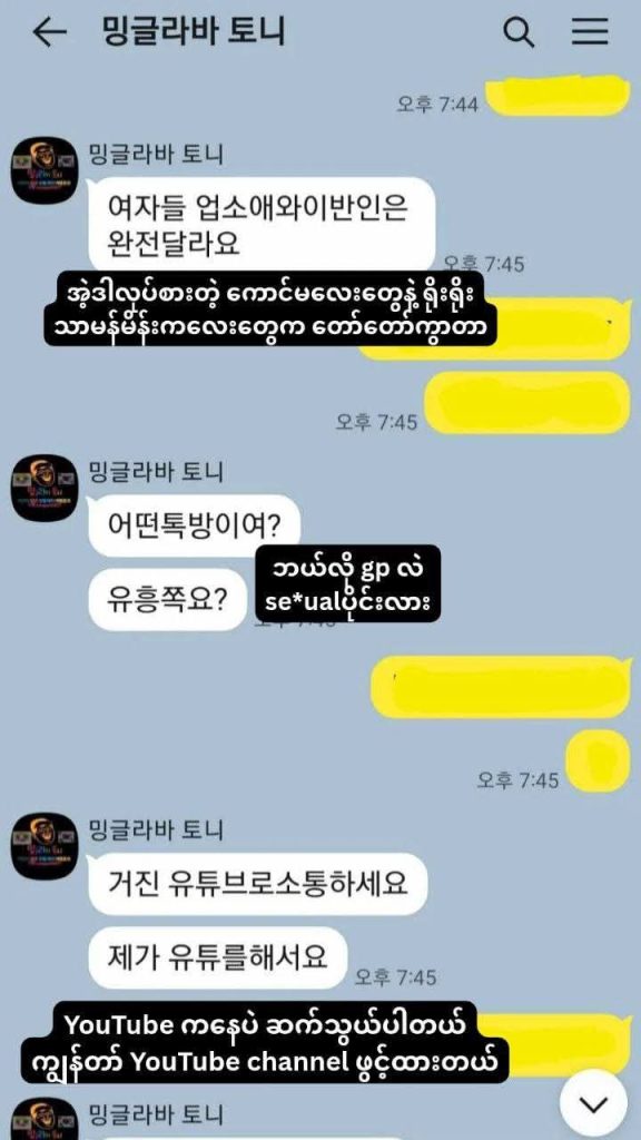 အဲ့ဒီကိုရီးယား အမျိုးသား YouTuber က မြန်မာပလာဇာ၊ အင်းယားကန်ဘောင်၊ လှည်းတန်းနဲ့ ဆူးလေတစ်၀ိုက် ကျင်လည်ကျက်စားကြောင်းလည်းသိရပါတယ်။ မြန်မာအမျိုးသမီးငယ်တွေကို ဓာတ်ပုံရိုက်ပေးမယ်လို့ပြောကာ ပုံ တွေ ပို့ဖို့ အတွက် viber နံပါတ်တောင်းယူပြီး အဆက်သွယ်တွေပြုလုပ်ကြောင်း ဒါ့အပြင် ကိုရီးယားစကားပြောတတ်တဲ့ မိန်းကလေးတွေကိုလည်း အလုပ်ရှာပေးမယ်ဆိုကာ ငွေနဲ့ဖျားယောင်းကာ ဟိုတယ်တွေမှာ ချိန်းဆိုခြင်း၊ ကိုရီးယားလူမျိုးများနဲ့ လက်ထပ်ဖို့ ဖျားယောင်းမြှူဆွယ်ခြင်း စတာတွေလည်း အဆက်မပြတ်ပြုလုပ်နေတယ်လို့ ဆိုပါတယ်။
